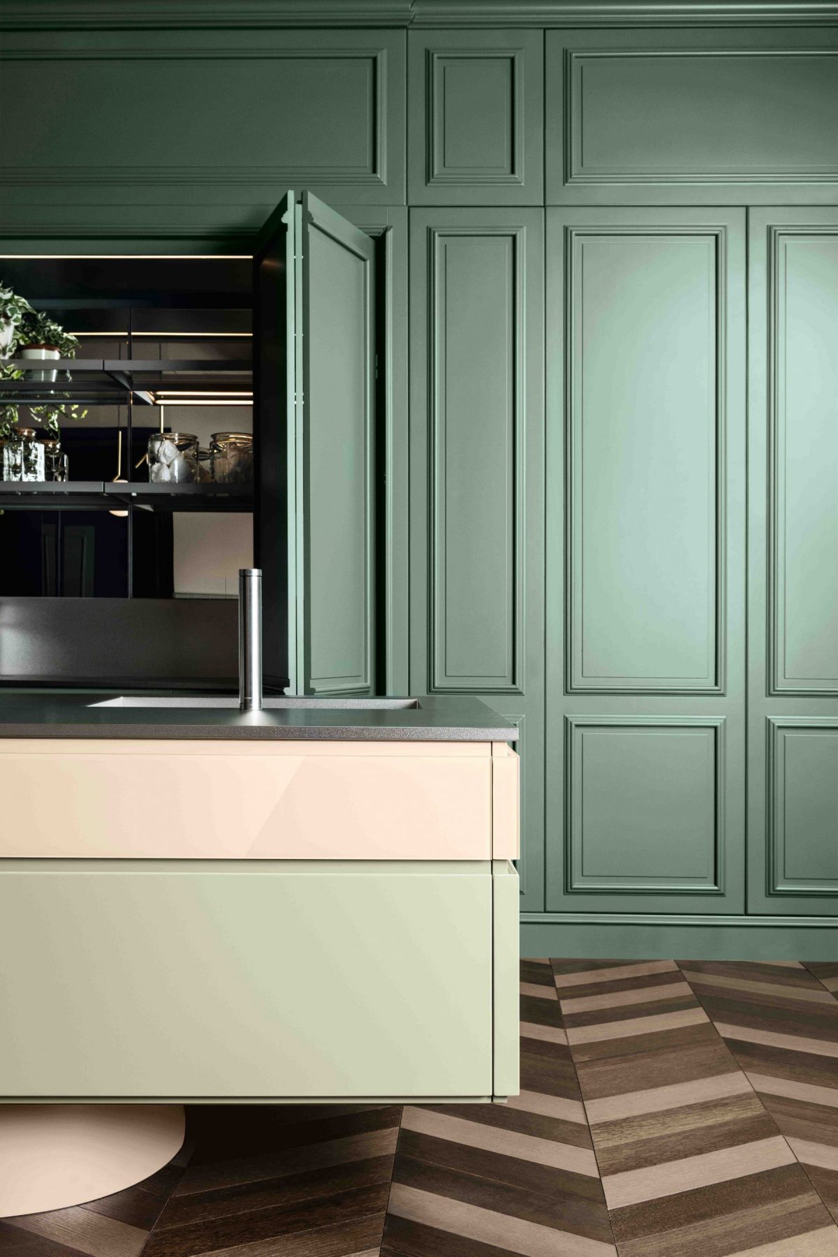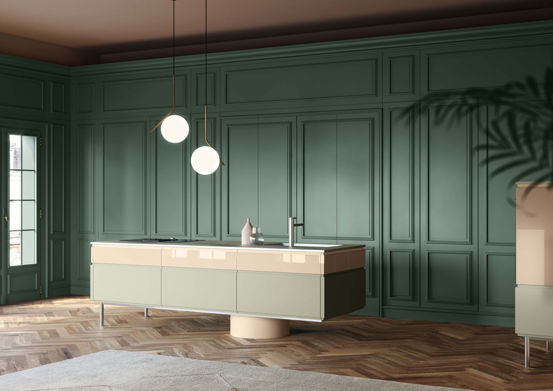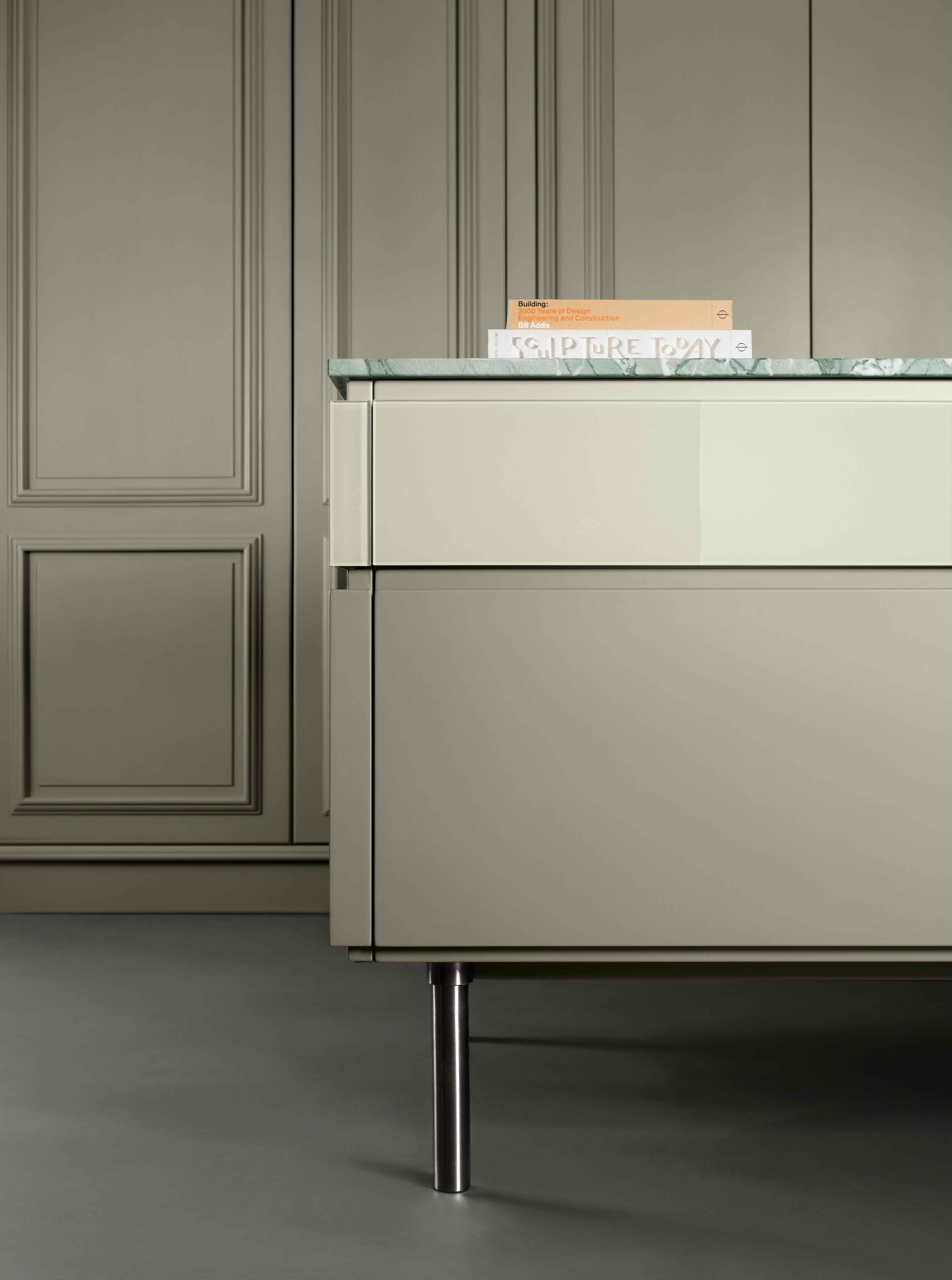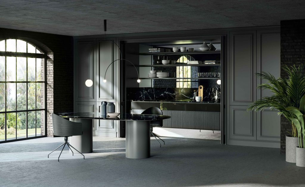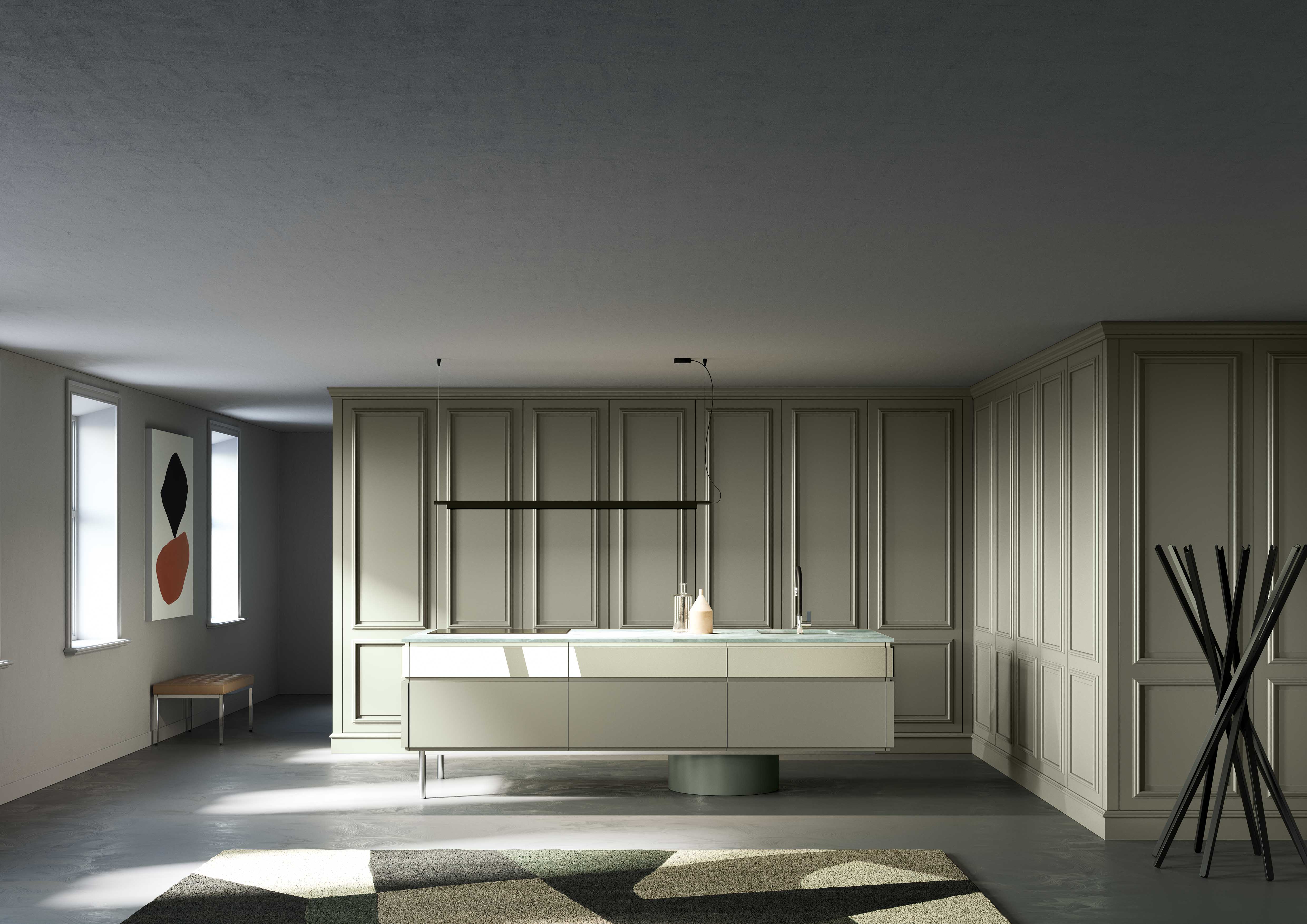 Lacquered green wooden wall panelling embraces the walls and expresses the manufacturing potential of L’Ottocento at its most concealing open compartments and functional spaces in stylistic contrast with Archetipo island. Born from the collaboration with makethatstudio, Archetipo recalls the simple shapes loved by Aldo Rossi and is characterized by the cylindric support.