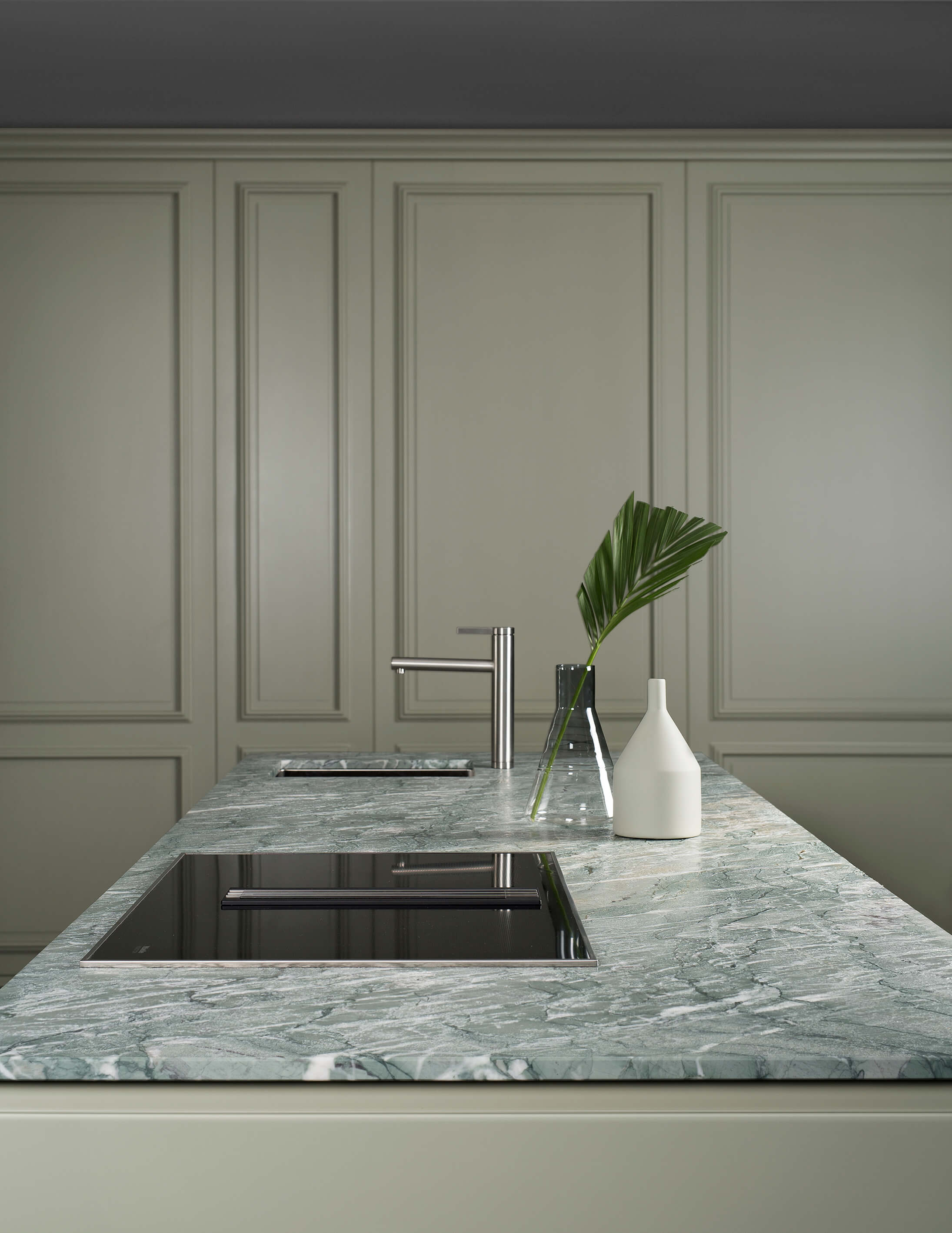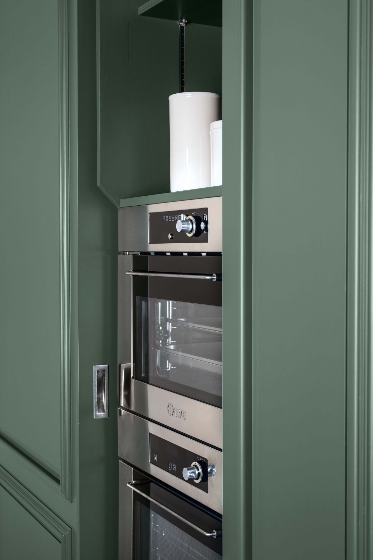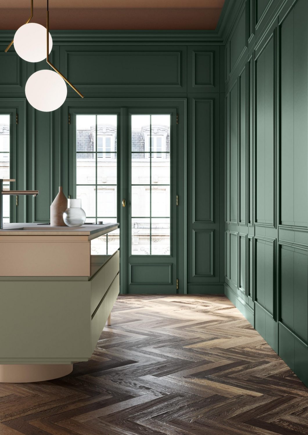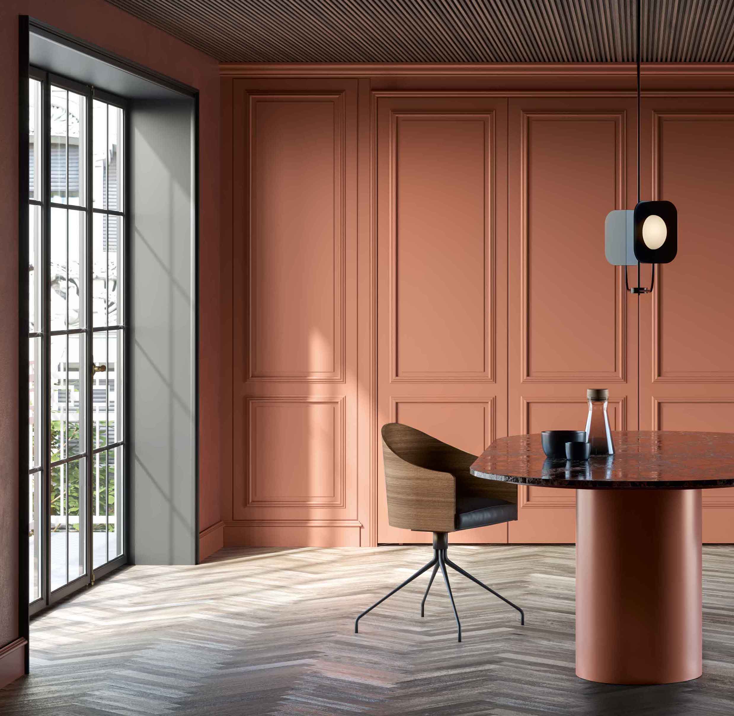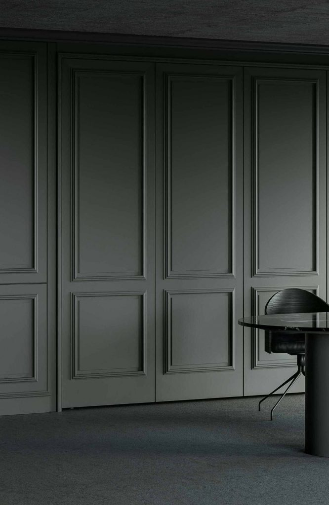 Lacquered green wooden wall panelling embraces the walls and expresses the manufacturing potential of L’Ottocento at its most concealing open compartments and functional spaces in stylistic contrast with Archetipo island. Born from the collaboration with makethatstudio, Archetipo recalls the simple shapes loved by Aldo Rossi and is characterized by the cylindric support.