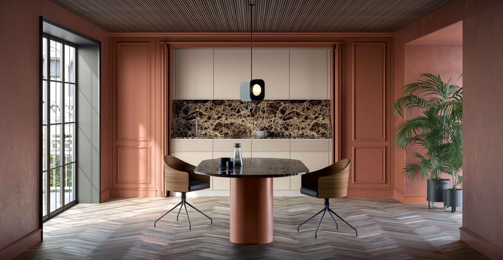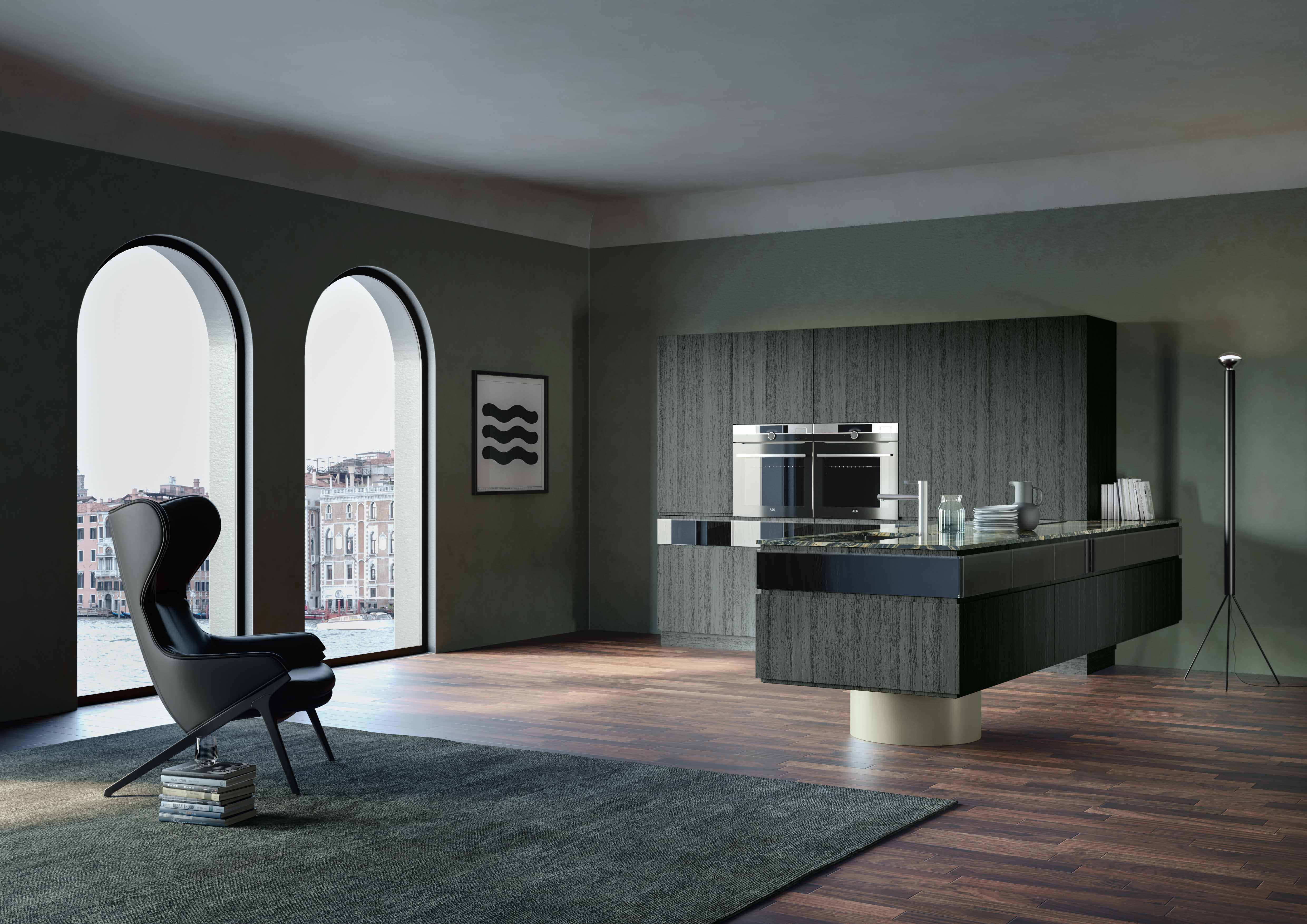 With Archetipo, kitchen spaces expand and go beyond the simple concept of functionality to take on aesthetic value. Equipped high Floral wall paneling in lacquered wood creates an elegant and versatile space, classic spirit meets the sleek shapes of the central island in a kitchen of unique taste.
