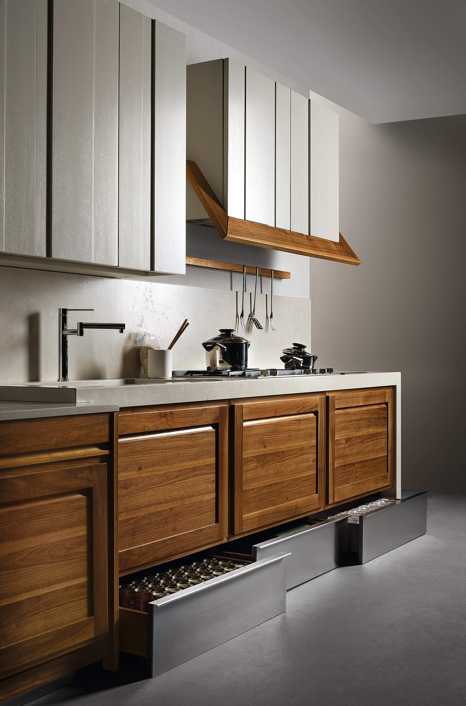 The integrated handles project, directly realized on the wood of drawers and doors, enhances the handicraft ability and highlights the wood of Canaletto kitchen.