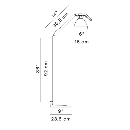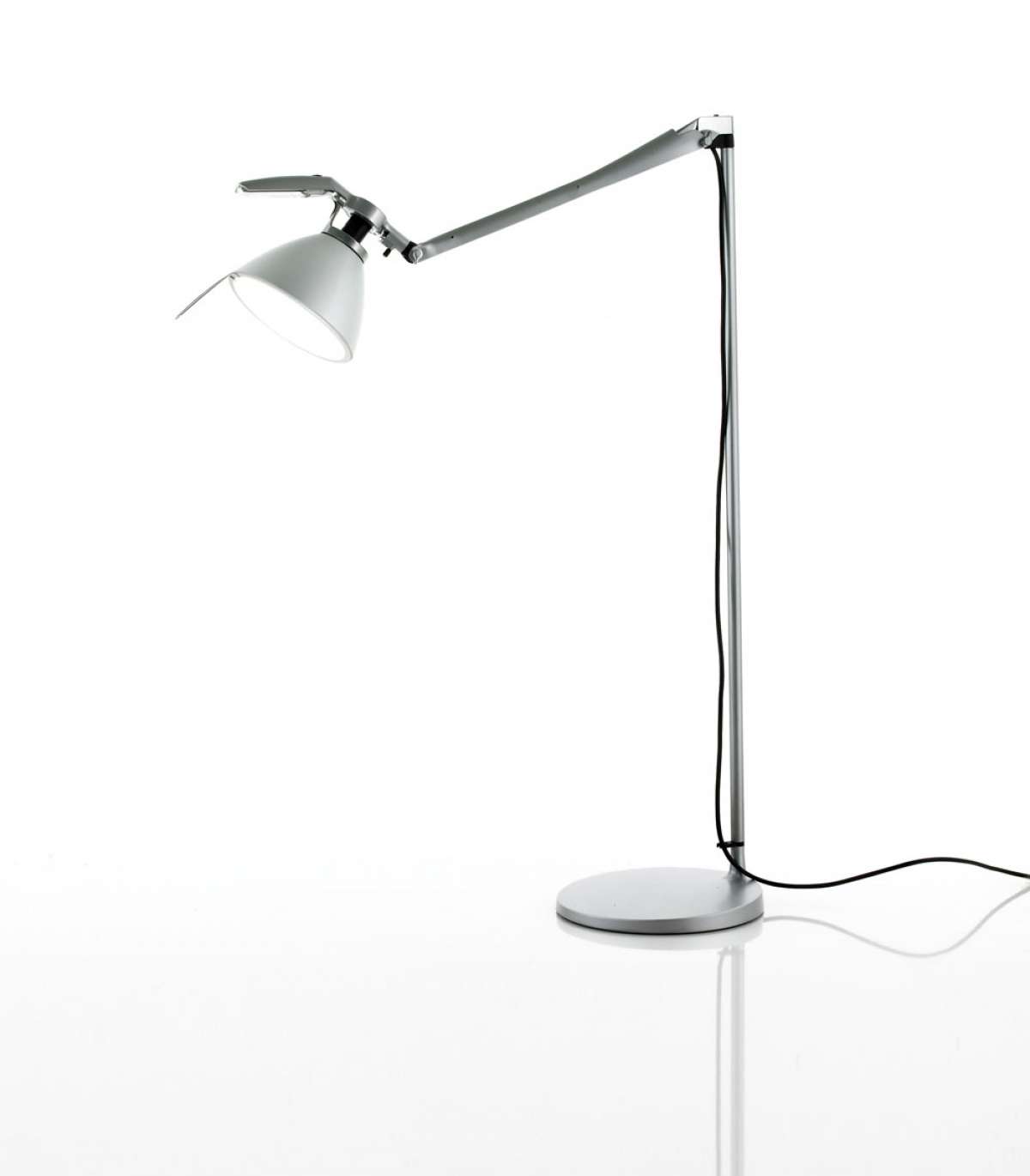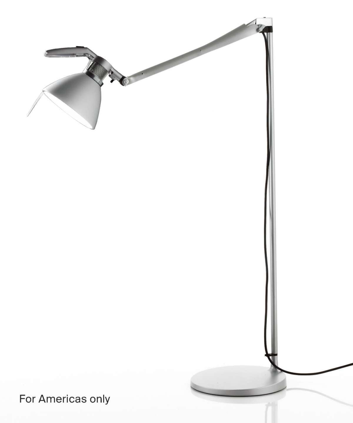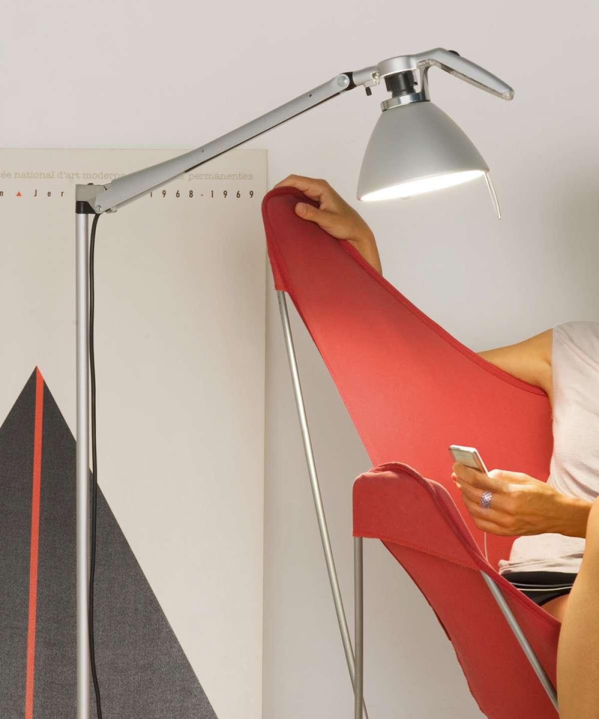 The floor version of the famous work lamp extends its range of application and its great functional quality, enhanced by the practical polycarbonate grip housing the on/off switch, to adjust lighting direction with great simplicity and precision.