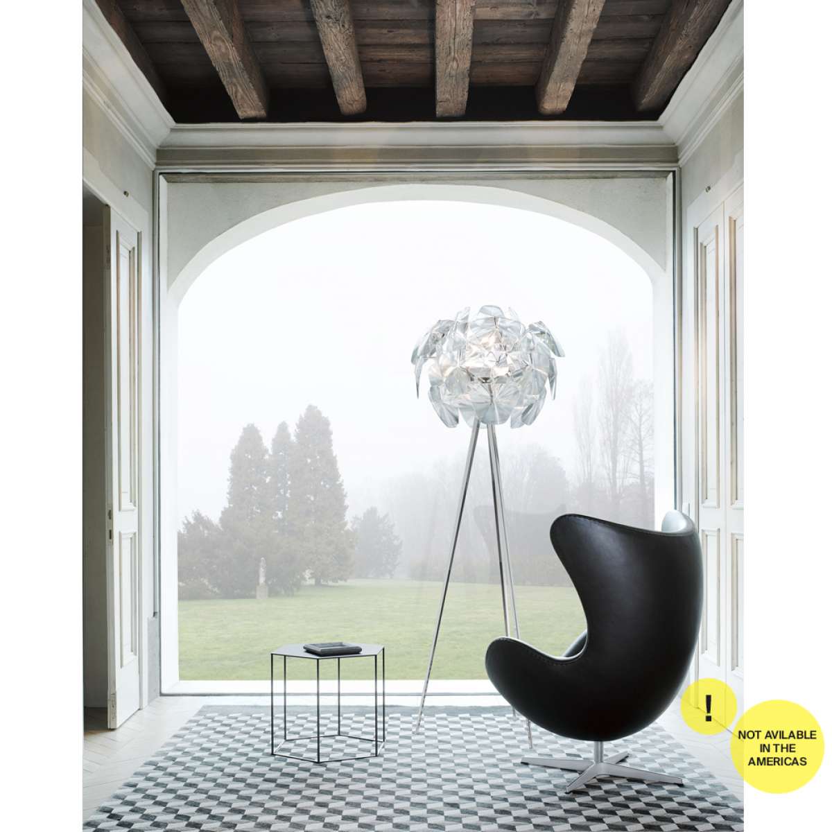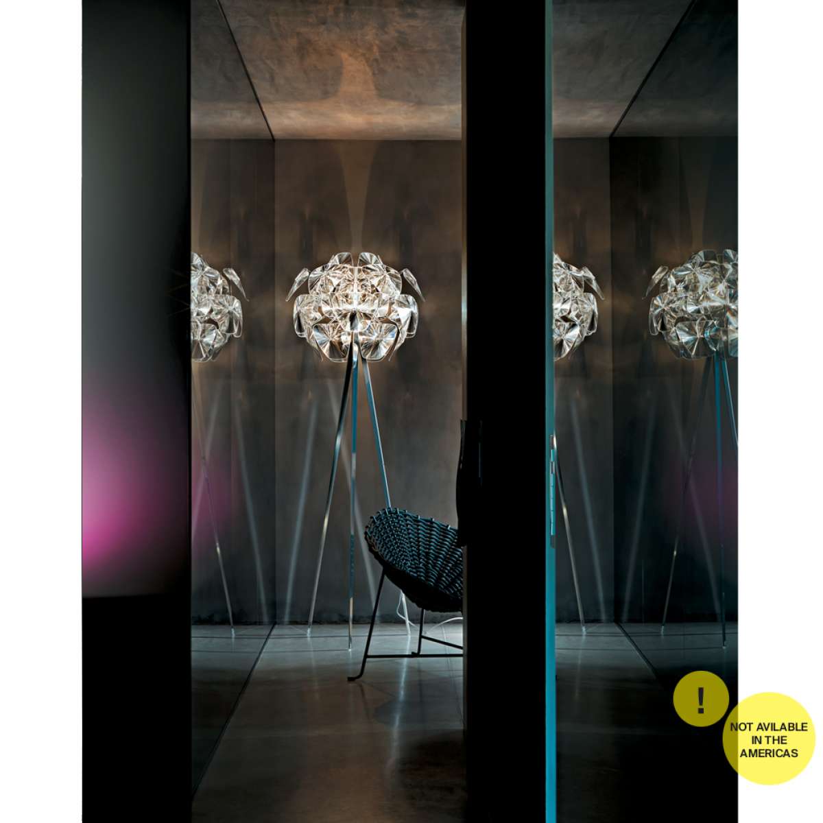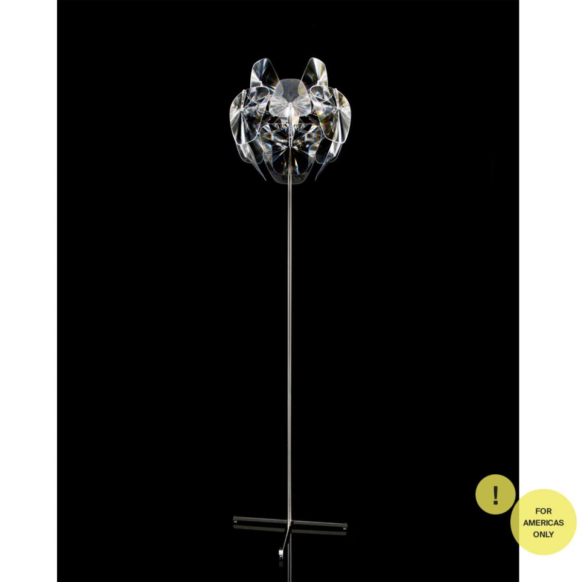 Hope revives the charm of the crystal chandelier, also in the floor model. The polycarbonate petals are flat Fresnel lenses with excellent reflective and refractive properties, coupled by means of injection-molded polycarbonate “twigs” mounted on a steel structure.