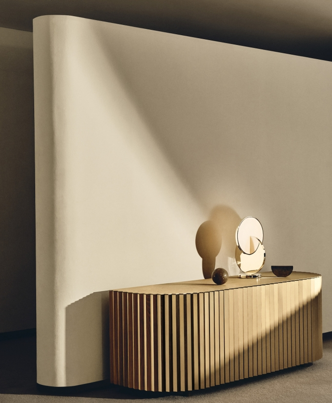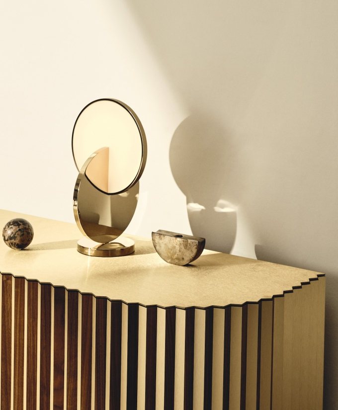 The Shadow Cabinet is a hand-made contemporary sideboard playing with the concept of optical illusion with traditional crafted materials. Sitting under a solid 3mm thick piece of brushed brass, a series of triangular facets run vertically down the front of the cabinet with one side in American walnut and the other in brushed brass or black inlay. From one angle, the cabinet appears to be all wood and from the other all brass depending on your viewpoint. The cupboards are all cleverly disguised within the vertical framework.