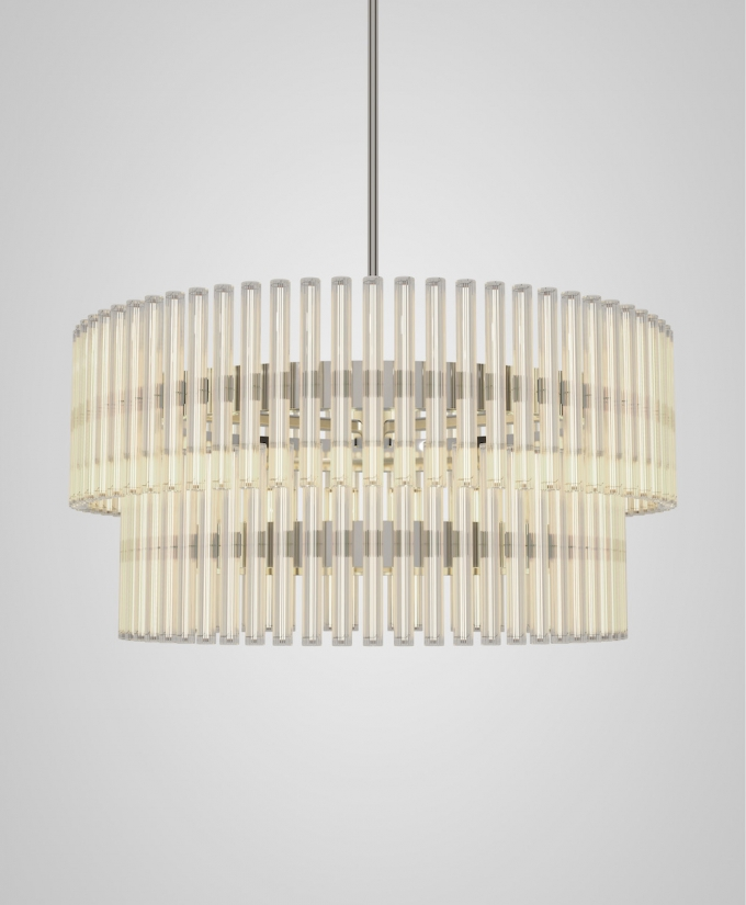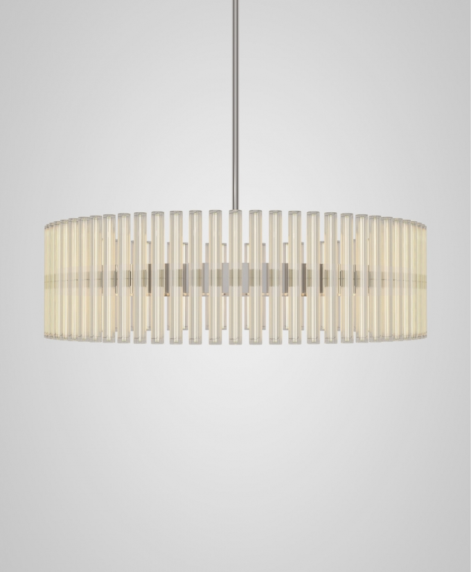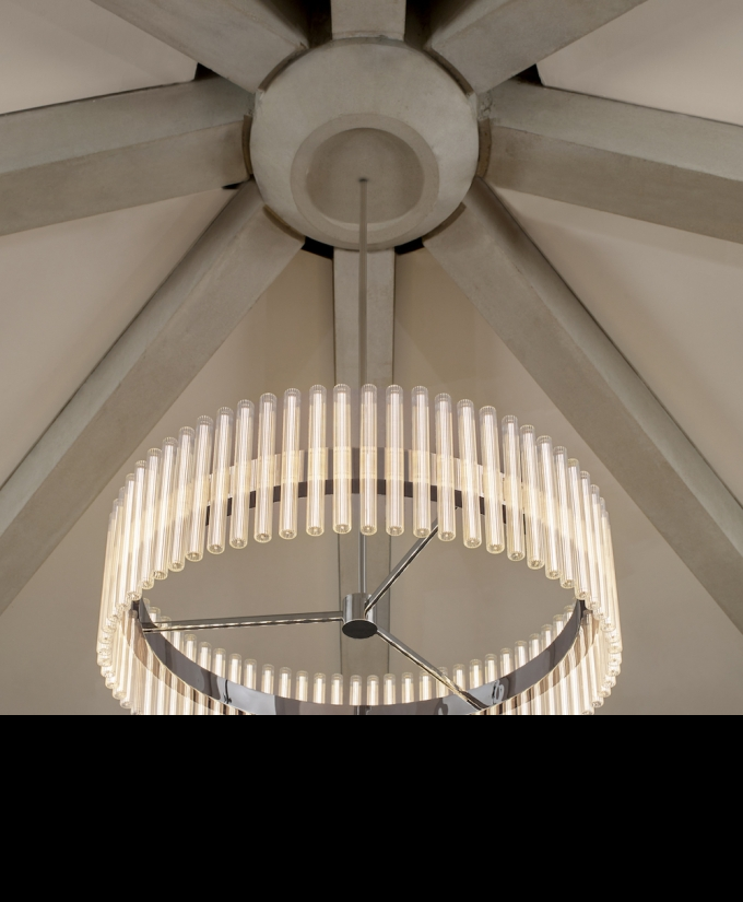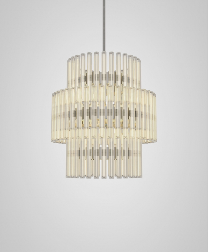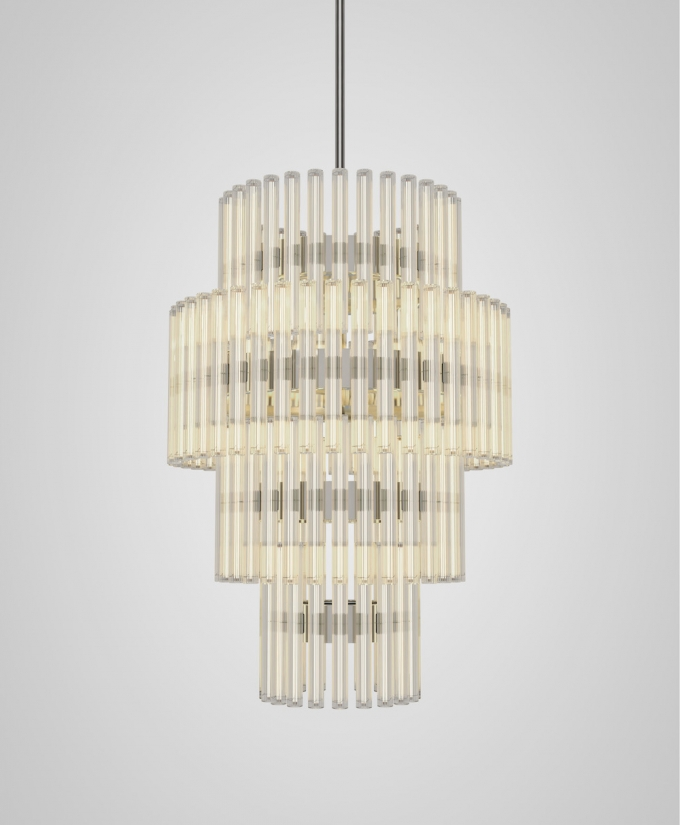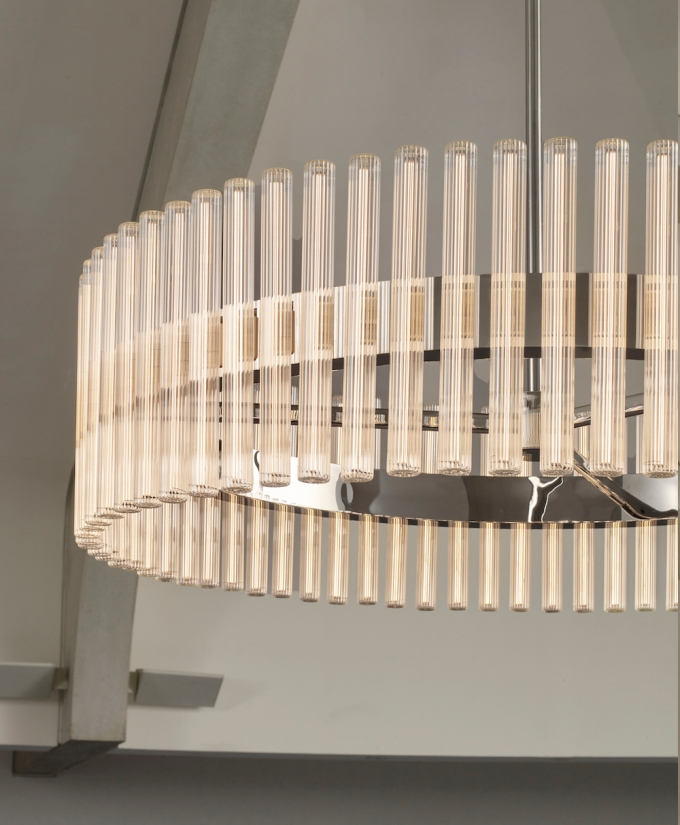 A chandelier of multiple adaptations which projects layers of ethereal rings of light created from linear LED light bulbs. Created and produced by Lee Broom, the hand blown glass bulbs contain a perpendicular LED filament which refracts against the vertical lines of the reeded glass. En masse and reflecting in the rings, the overall effect ensues a glowing aura.