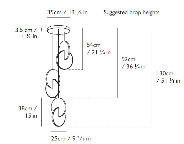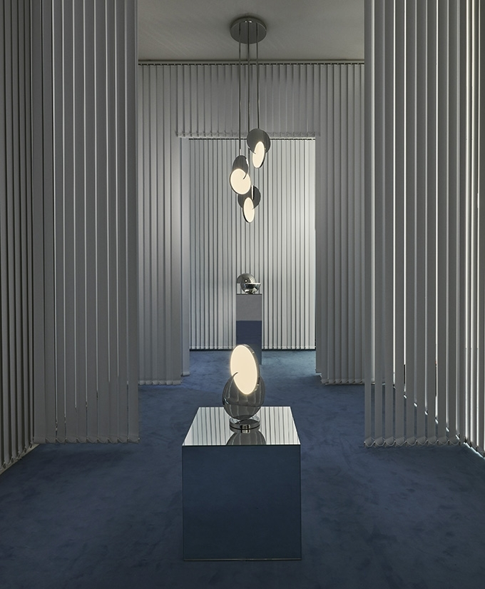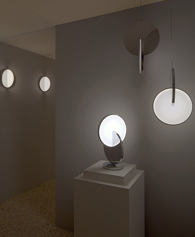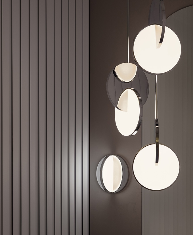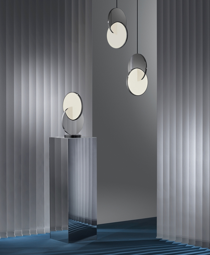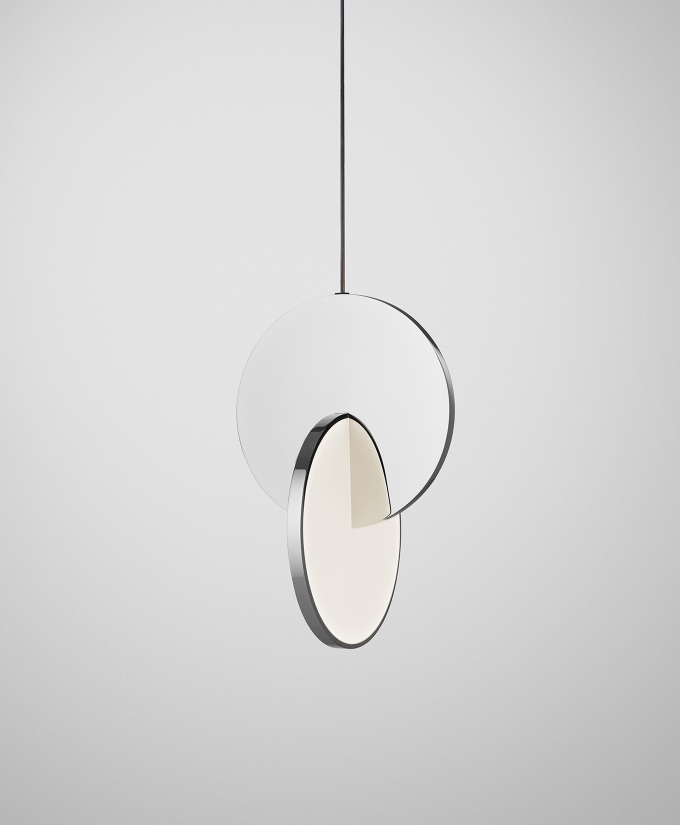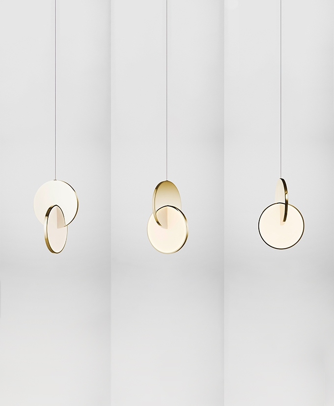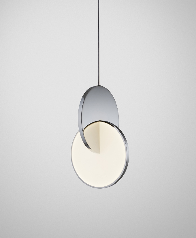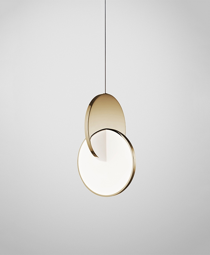 Eclipse Pendant is celestial in both its name and inspiration. Mirror-polished gold and acrylic discs interact, dissect and obscure, which both eclipses and reveals its illumination to the viewer at the same time.