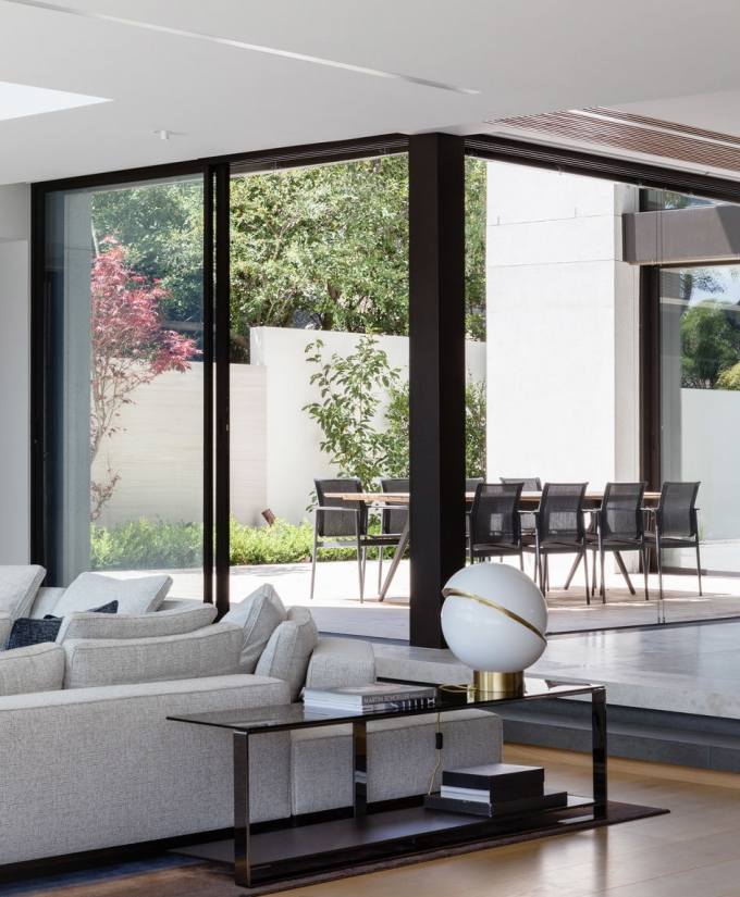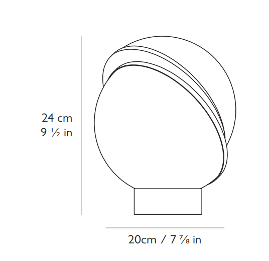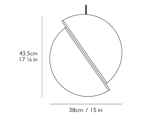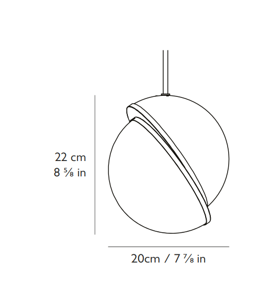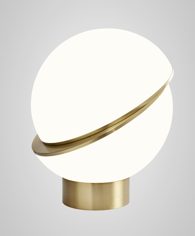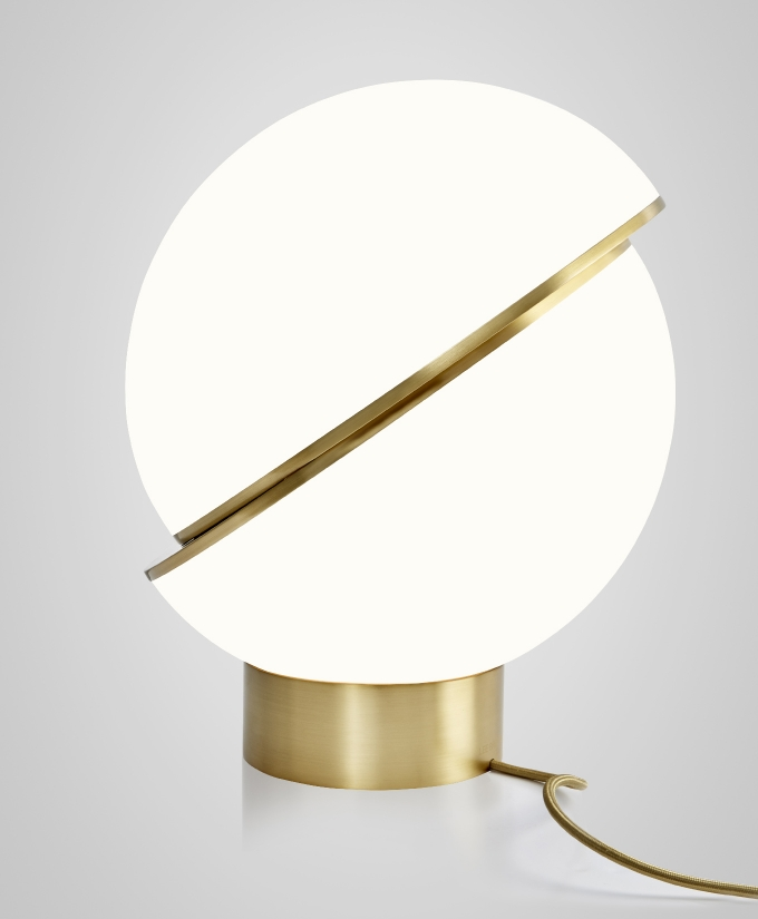 An illuminated sphere sliced in half to reveal a crescent-shaped brushed brass fascia, Crescent seamlessly combines the solid and the opaque.