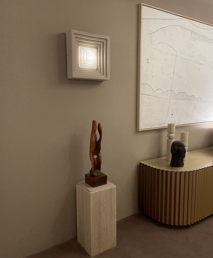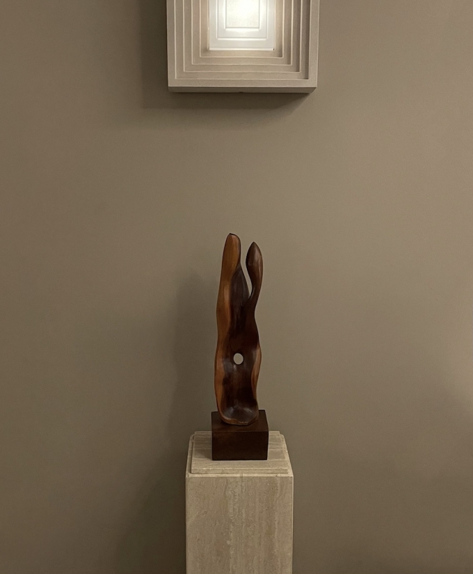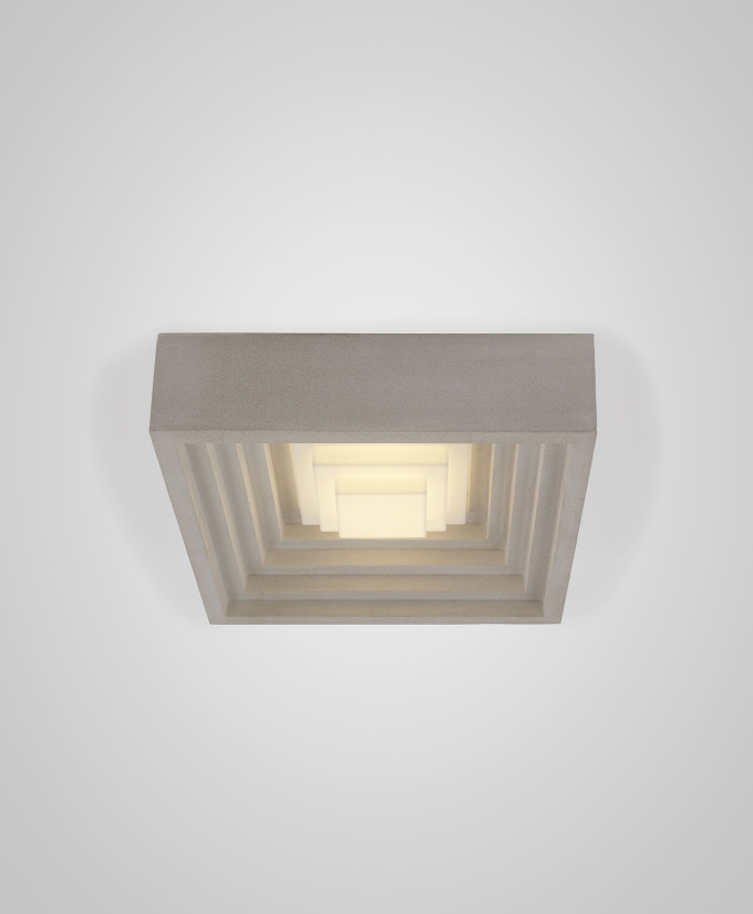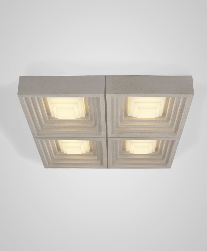 Pantheum is inspired by the distinctive concrete ceiling of Rome’s ancient temple, The Pantheon, as well as the clean lines and geometry of Brutalist architecture. Cast by hand in Jesmonite, its silhouette is a stepped tile-like square that is then sand blasted to give its rough sandstone hewn surface. Pantheum is a surface light, each can be hung on its own or composed in symmetrical clusters to create a ceiling or wall constellation.