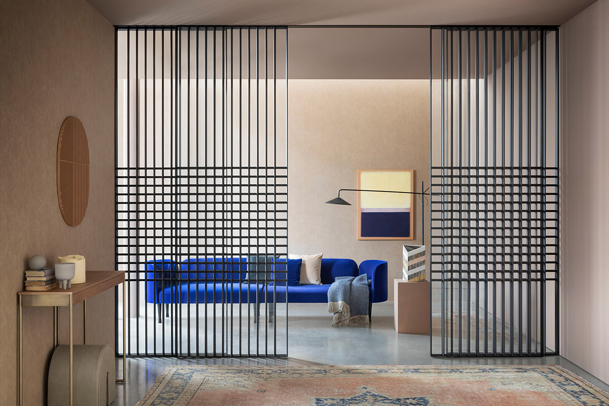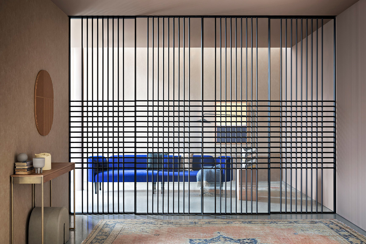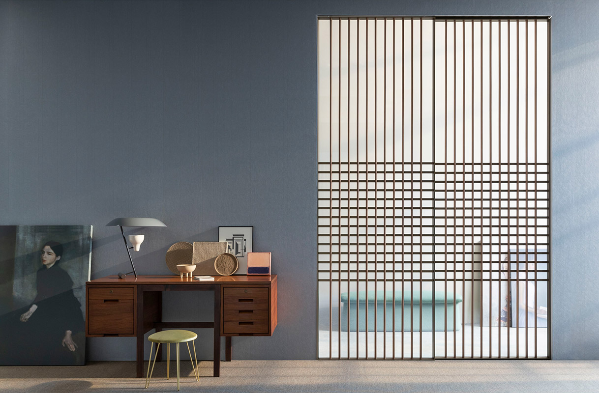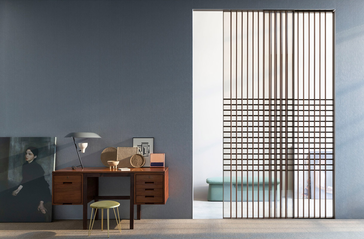 La porta per interni esterno muro Drive è un sistema combinato di porta scorrevole e di binario telescopico predisposto per essere installato direttamente a parete. Può leggersi come una superficie appoggiata alla parete.