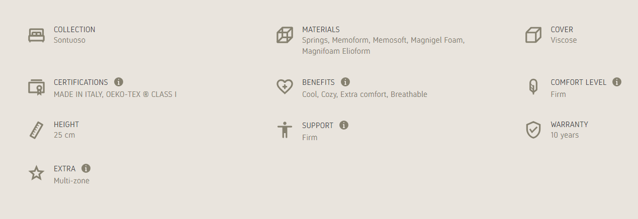 Sontuoso Primo 10 embodies all the wealth of a handcrafted tradition and combines it with the high quality of the materials and the use of the most advanced manufacturing technologies. The art of knowing how to help people sleep in style is authenticated by the elegant signature design and provides a soft support in 25 cm of height.