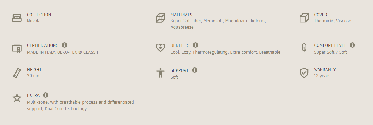 With the Nuvola Dual 12 of the Nuvola line you will experience a light sensation of dry and breathable freshness, a thin pleasure that satisfies the body and relaxes the mind. The innovative materials provide a soft support to your body at 30 cm of height.