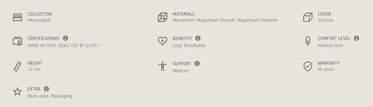 Memorabile 9 of the Memorabile collection, with the massaging effect provided by the inner layer, offers ideal support to the different parts of the body. A pleasant and customized comfort at 22 cm of height.