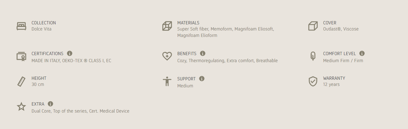 Comfort Deluxe Dual 12 Firm of the Dolce Vita line is inspired to the excellence of Made in Italy and Italian lifestyle. The combination of materials like Memoform, Elioform and Eliosoft, along with the refined cover in Viscose and the innovative Outlast? fabric, provide a firm support at 30 cm of height. The Dual Core technology ensures the perfect comfort for couples with different comfort preferences.