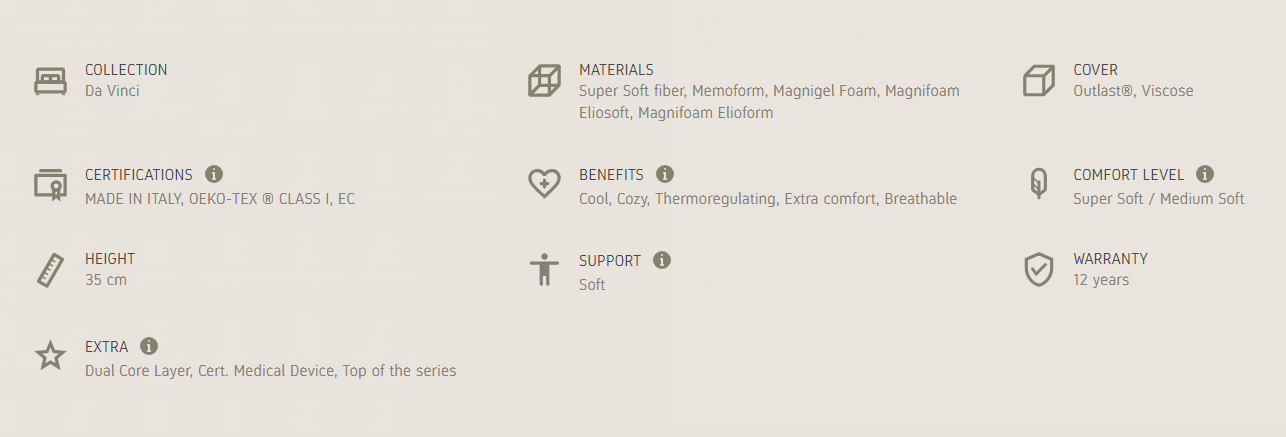 Leoanrdo Dual 14 of the Da Vinci collection is an elegant and sophisticated edition for those seeking the ultimate in relaxation without any compromise. The Dual Core technology makes it perfect for the couple that want a customized comfort. A cool and refreshing comfort thanks to Magnigel Foam for gentle support in 35 cm of height.