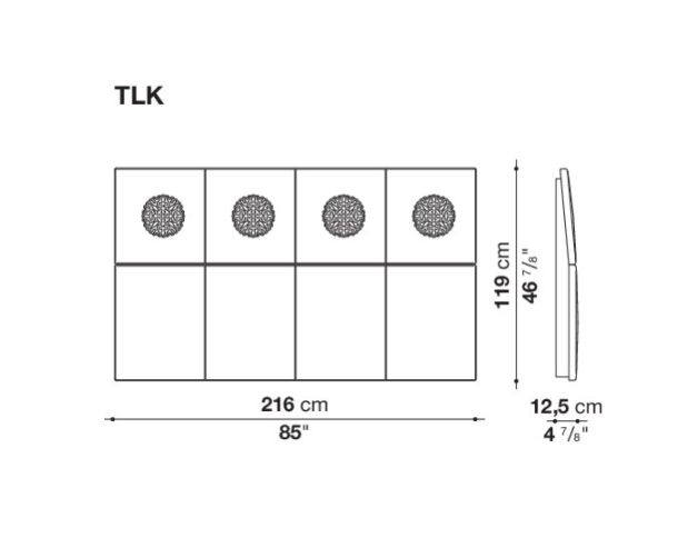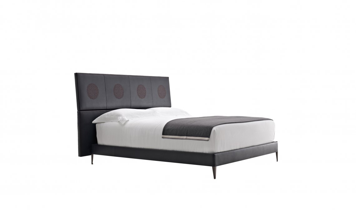 The Erik headboard (wall mounted at different heights) is made up of two panels. The top panel is slightly inclined and has a decorative element that softens the essential design. A circular lace motif repeated four times, in matching tones or contrast, accompanies a blanket stitch border around the upper perimeter of the headboard. These decorations recall the tradition that made Cantù famous for its handmade lace, when “bisetta” was the word (in the local dialect) for the type of lace used for Erik.