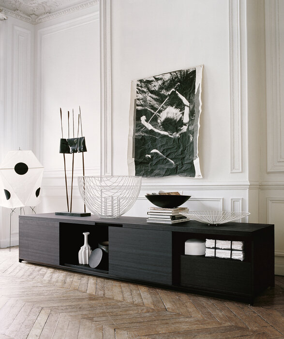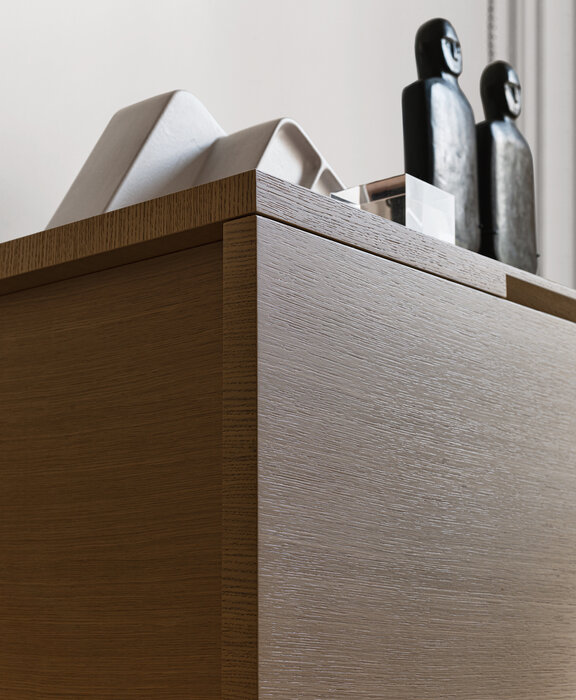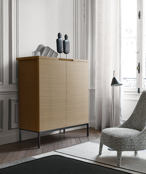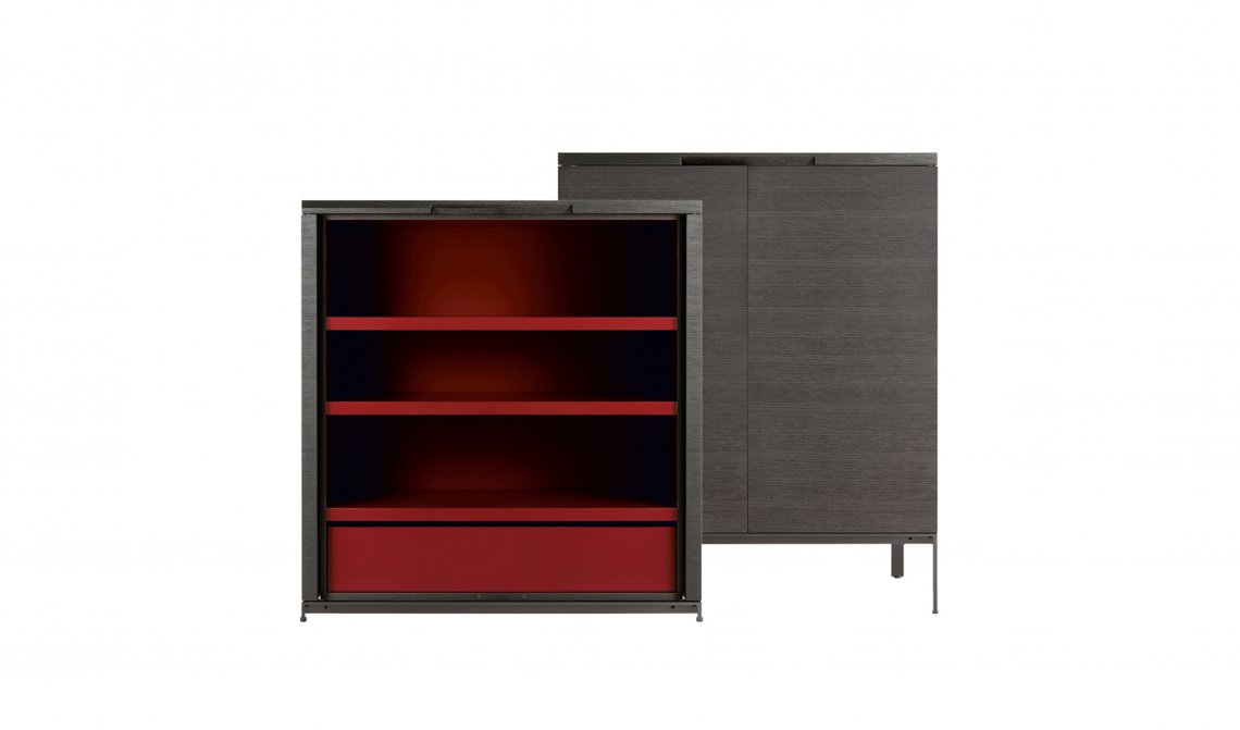 The common denominator in Mida storage units is a base-frame of steel profiles which supports various typologies of storage units: the smallest with feet are available in two heights, doors that rotate outwards 270° and different internal equipment; the low and long sideboard with rotating doors reveals either the two external compartments or the central compartments. Different types of wood available including a cut that reproduces the manual craftsmanship of sawn edges, leaves traces of processing that add value to its timeless elegance, a distinguishing feature for Maxalto. The internal frame of storage units are in wood or glossy finish.