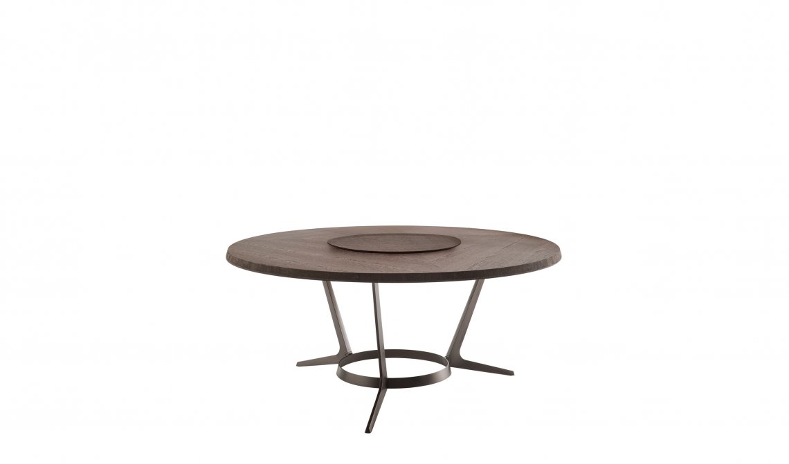 Astrum is a collection of tables, rectangular, round and oval, distinguished by the special “sawhorse” base-frame. The frame is made of a single die-cast aluminium support with painted finish that, based on the table shape, is composed of two or three elements connected by a crosspiece and forming the base-frame for rectangular tables, while three elements connected at the base of a steel ring establish the support for round tables. The triangular section of the support, raised from the ground with a slight tilt, gives the structure both lightness and solidity. The tables tops are provided in various finishes of wood, lacquered and marble. Only with the round versions it is possible to insert a swivel tray.