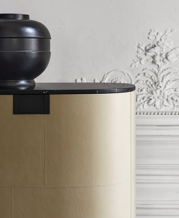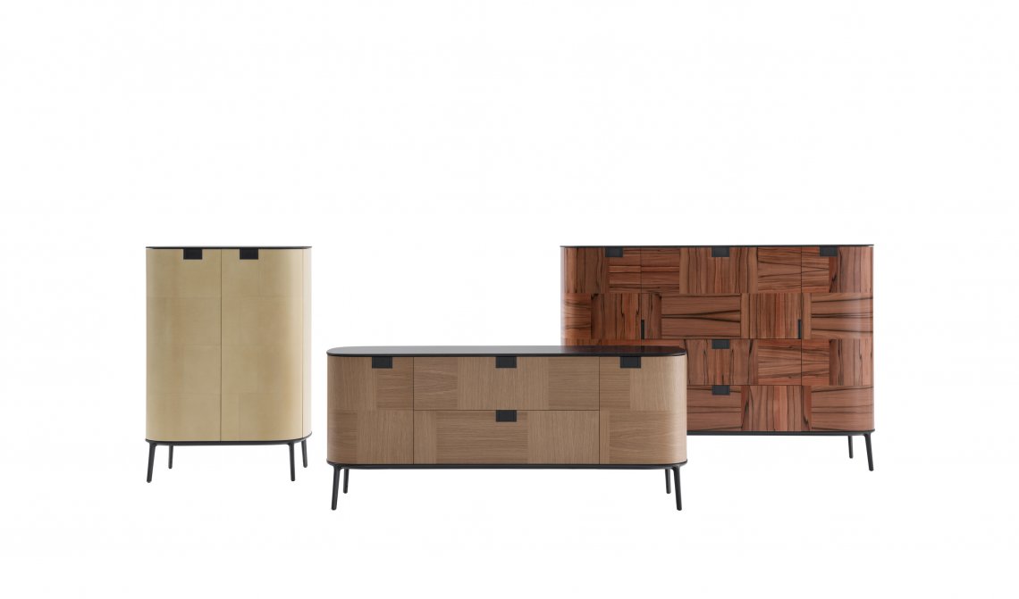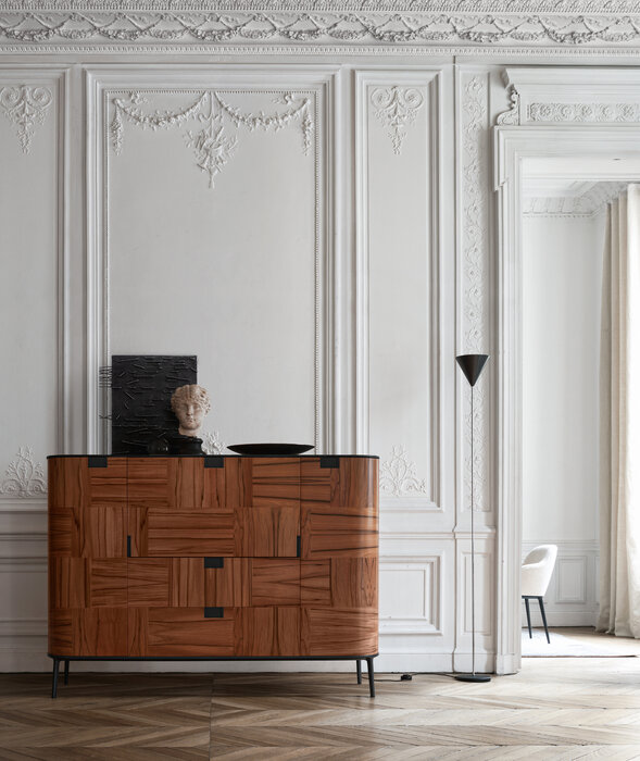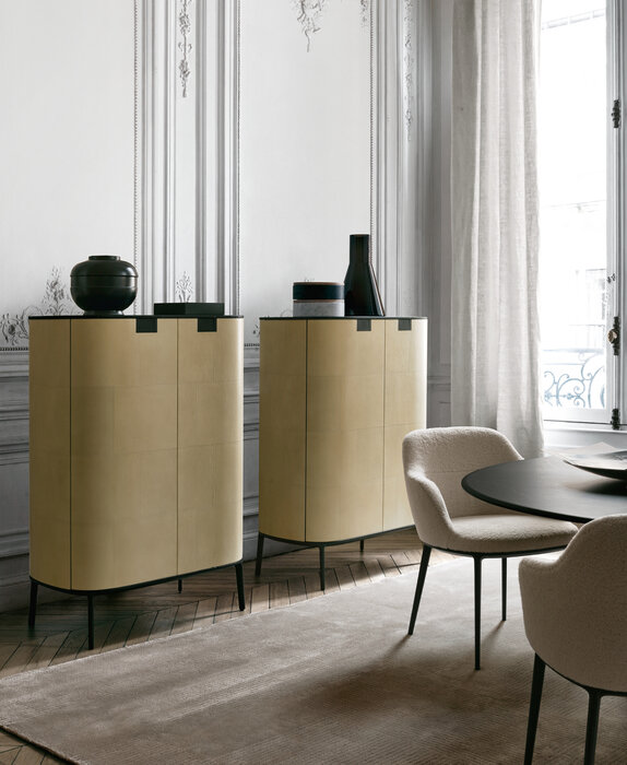 Tesaurus is a series of refined storage units. The shape underlines the high quality of the craftsmanship, starting with the curved wooden doors that open to reveal slightly protruding shelves, and a continuous profile that follows the volume’s. Tesaurus is available in three different heights and widths, with two or four doors, with drawers and flap doors. The base is a die-cast aluminium structure borrowed from the Caratos chair design, while the element above is a top in black Marquinia, white Calacatta or Emperador marble. The interiors are made of refined maple frisé. The craftsmanship is expressed in the luxurious parchment or wood finishes. The veneered oak or Chilean Tineo wood is made with a staggered checker motif with crossed grains. Parchment covering is a long and meticulous process and needs to be laid by specialised craftsmen who are trained to respect the natural material’s characteristics. Over the passage of time the parchment surface matures so that, like a good wine, it will be transformed and acquire new sophisticated hues. Thanks to the complex hand crafted processes inherent in the manufacturing processes, the value of Tesaurus is immediately obvious. Each piece in this collection becomes a unique object, difficult to imitate and authentically exclusive.