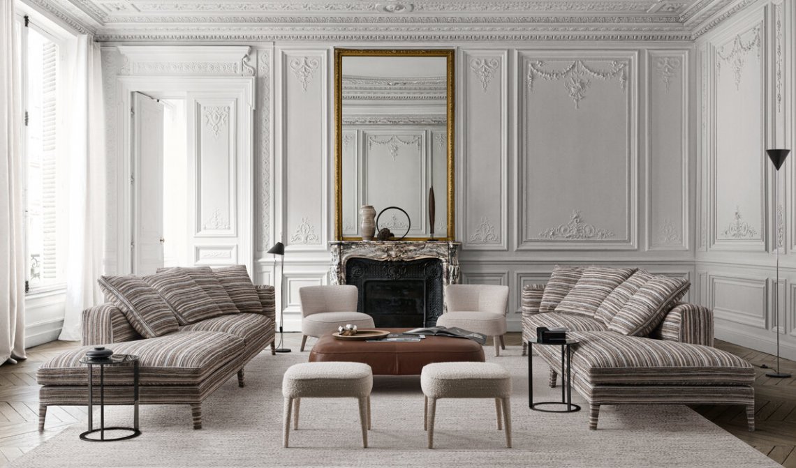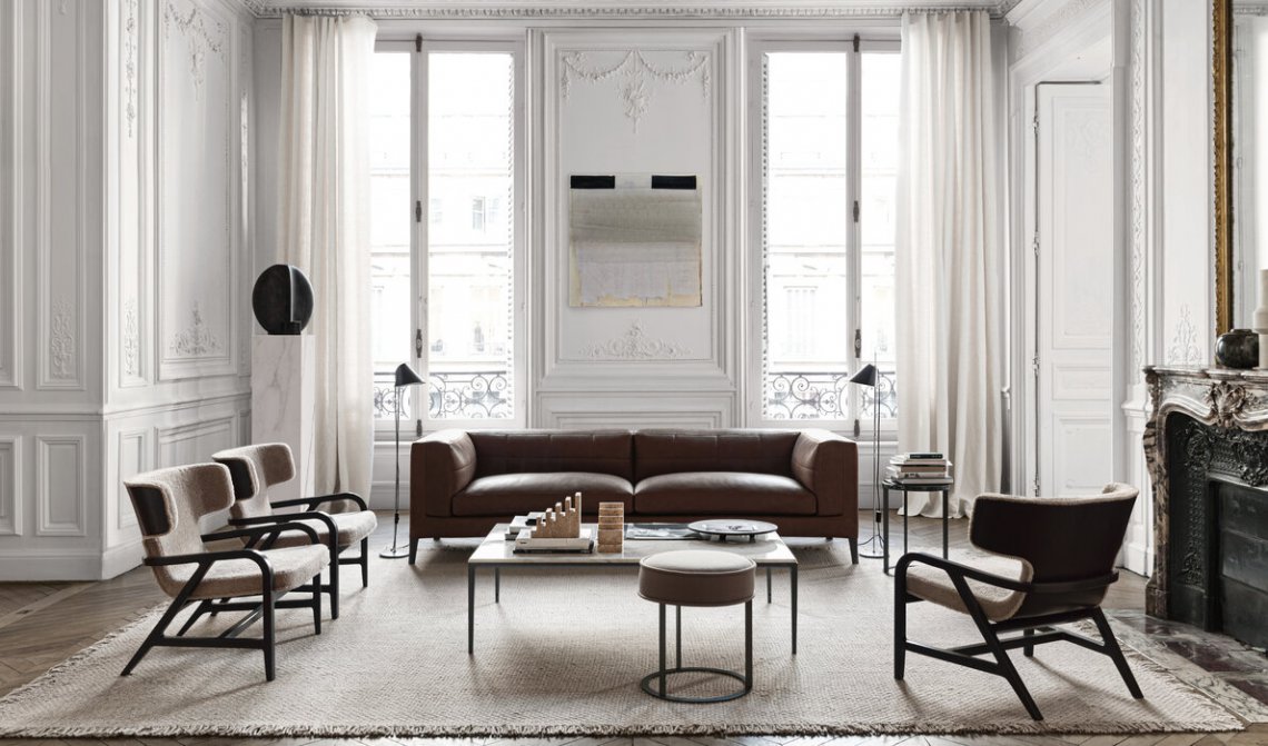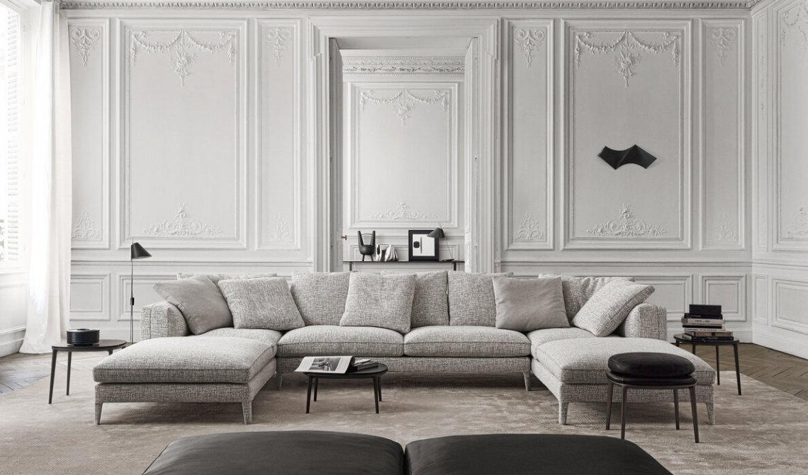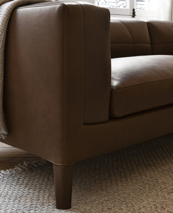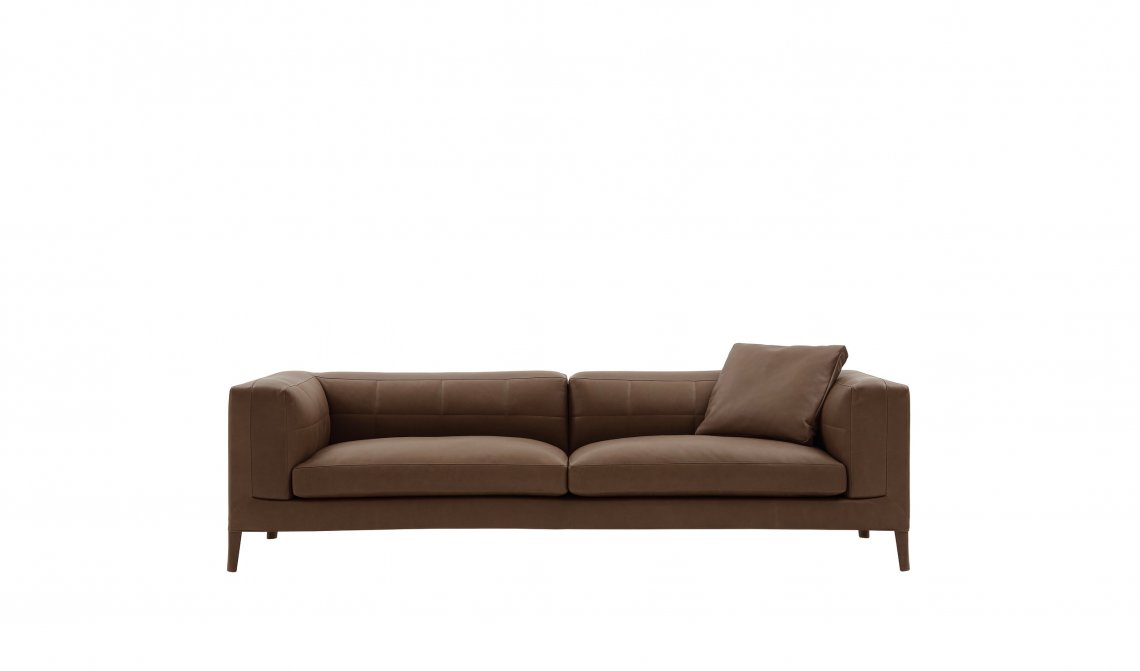 Dives Soft is a family of linear and modular sofas available in various sizes and in two seat depths. The version with a narrower seat depth is distinguished by its armrests and backrest, which feature two different upholstery styles: smooth on the exterior and quilted in classic Chesterfield style on the interior. A sophisticated and refined detail to be enjoyed. In the version with a wider seat, the upholstery is entirely smooth, with soft down feather cushions making for an even more welcoming and relaxed looking sofa. Both versions share the same, soft and generous padding, for optimal comfort. The upholstery comes in a wide range of fabrics and leathers with special couture details: decorative, matching or contrasting blanket stitching for the fabric versions, and elegant “envelope stitching” for the leather ones. The feet are either covered in fabric or leather or available in a shellac finish.