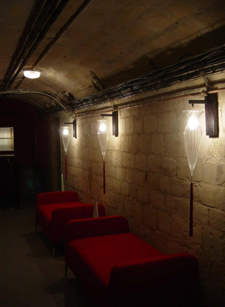 Suspension lamp. Hand blown titanium metallized glass dome with internal frosted bubble glass sculpture.