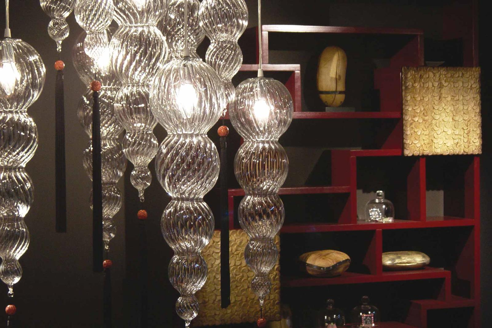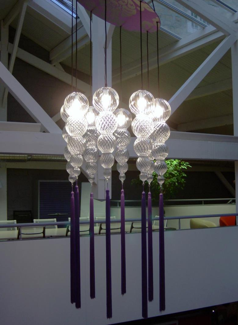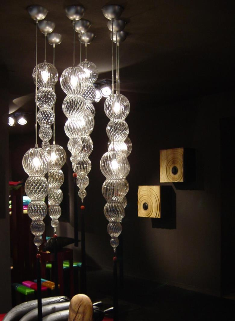 Suspension lamp. Hand blown titanium metallized glass dome with internal frosted bubble glass sculpture.