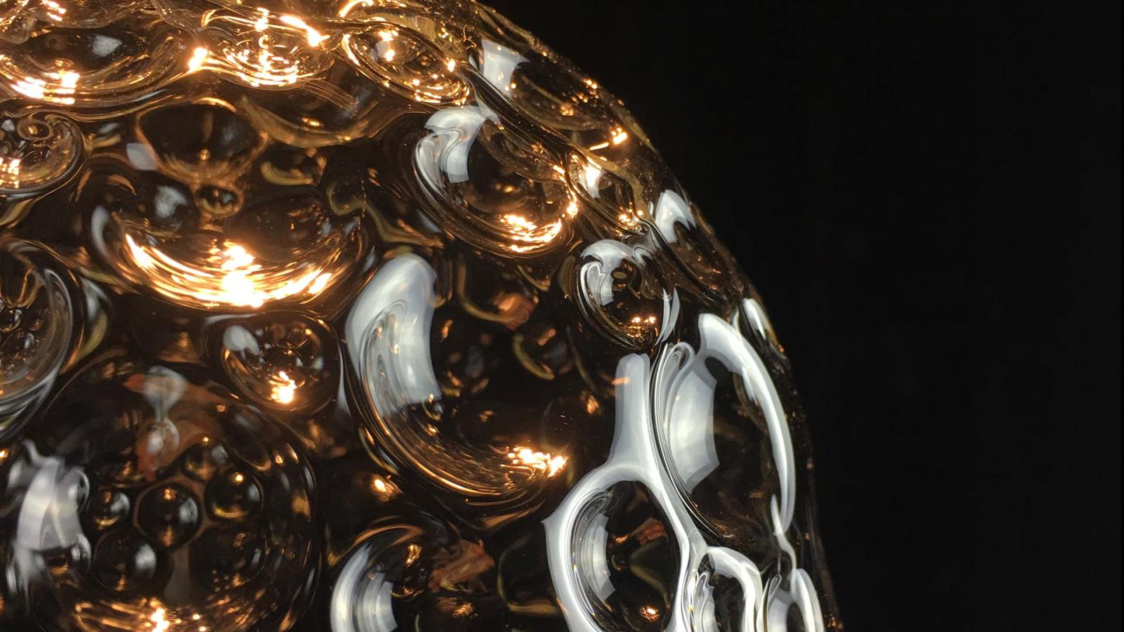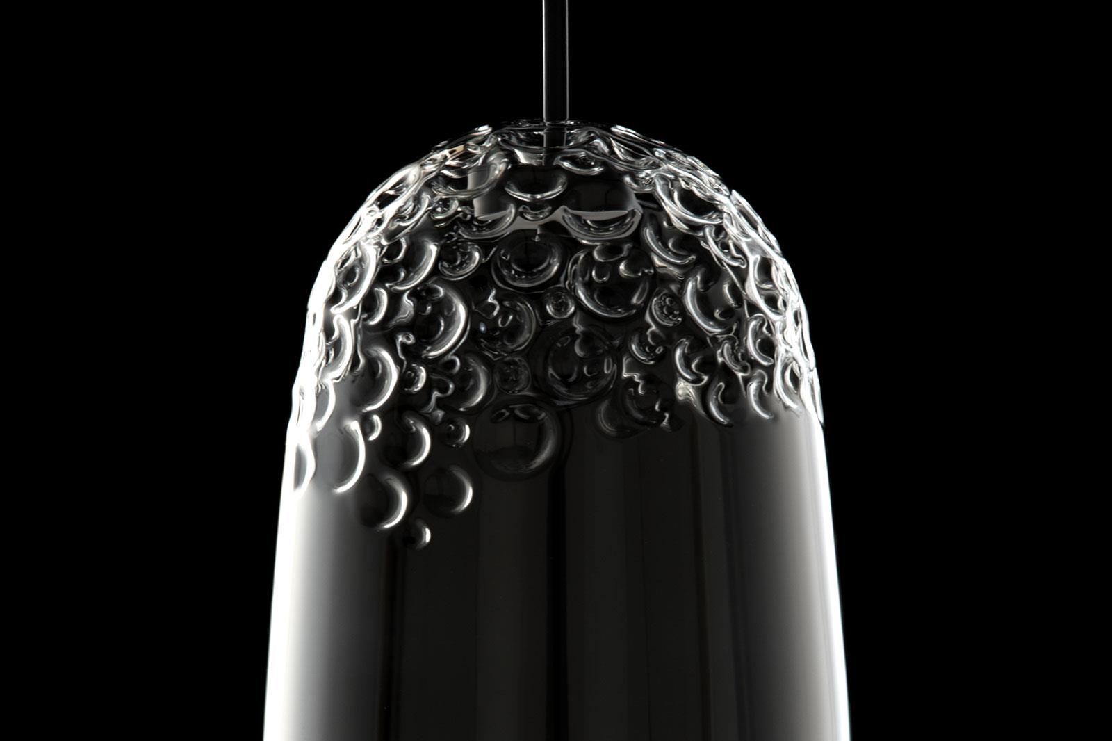 Suspension lamp. Hand blown titanium metallized glass dome with internal frosted bubble glass sculpture.