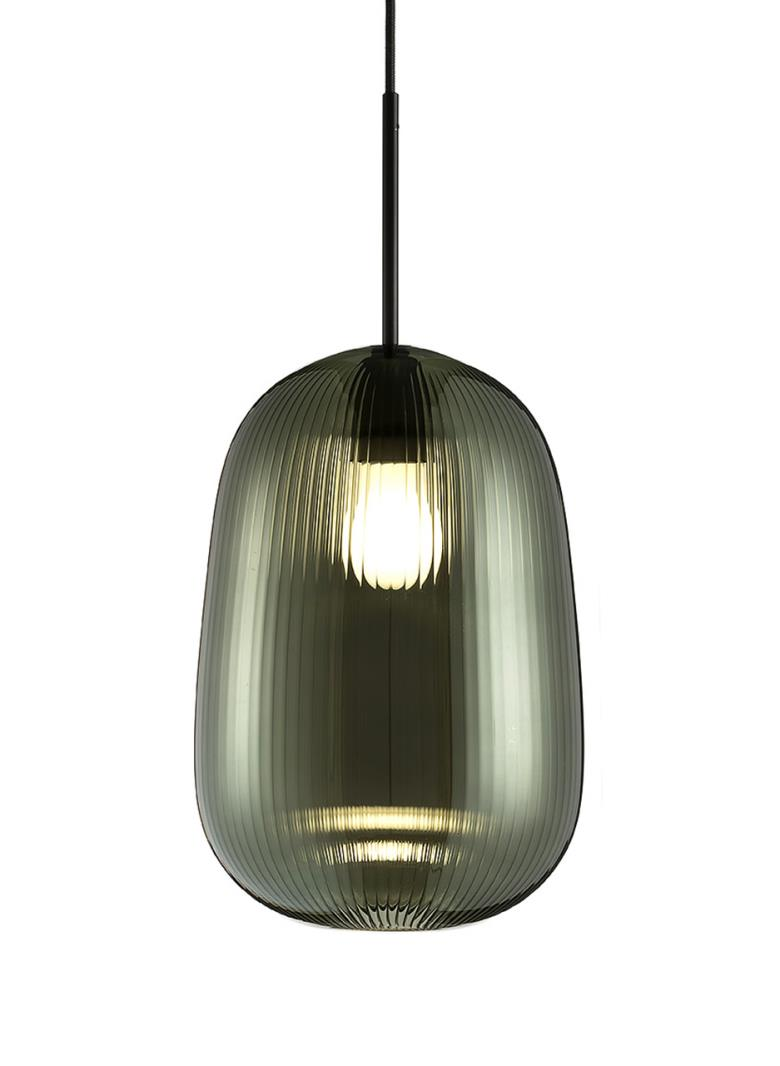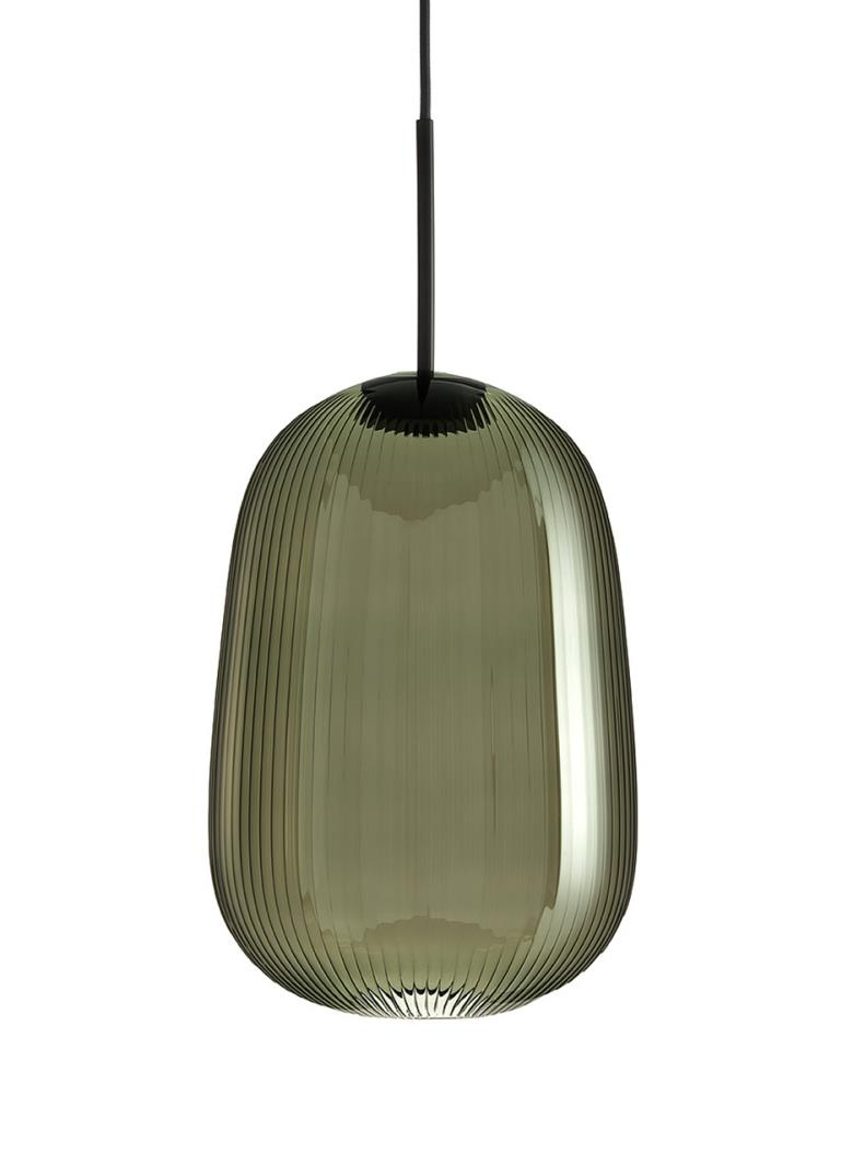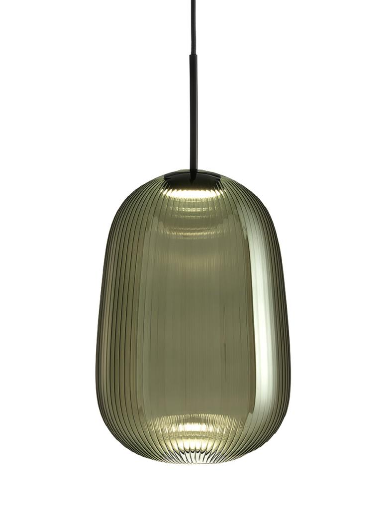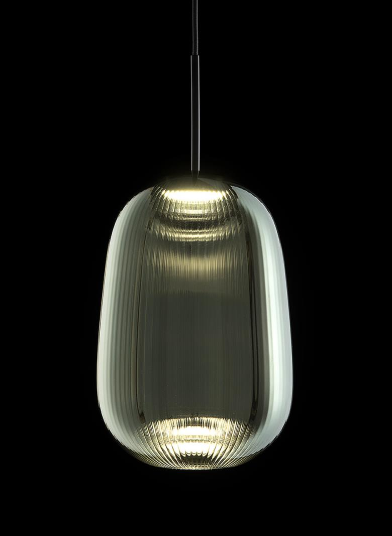 Suspension lamp. Hand blown titanium metallized glass dome with internal frosted bubble glass sculpture.