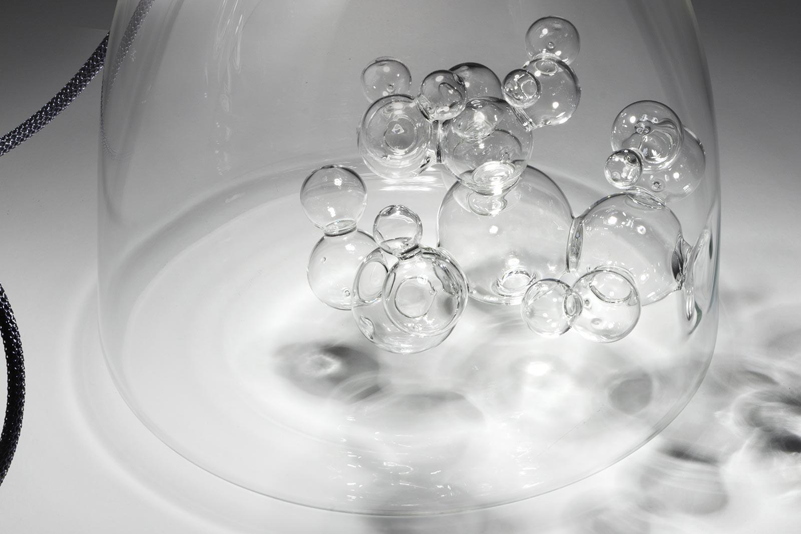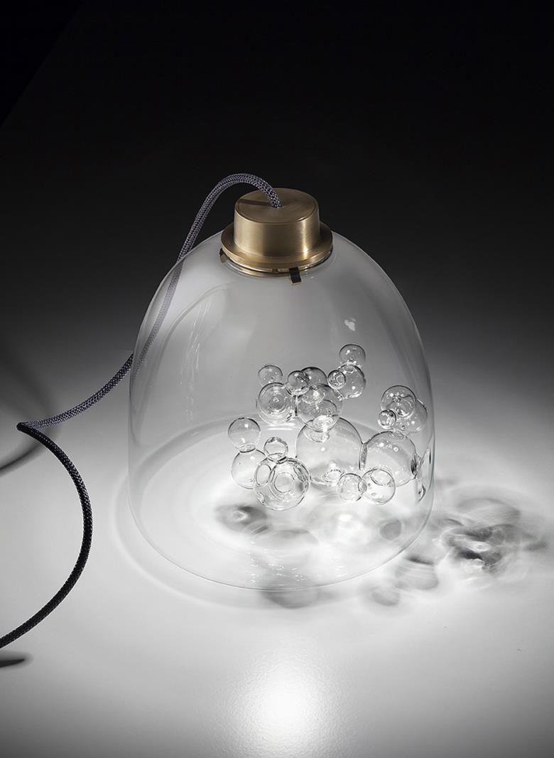 Suspension lamp. Hand blown titanium metallized glass dome with internal frosted bubble glass sculpture.