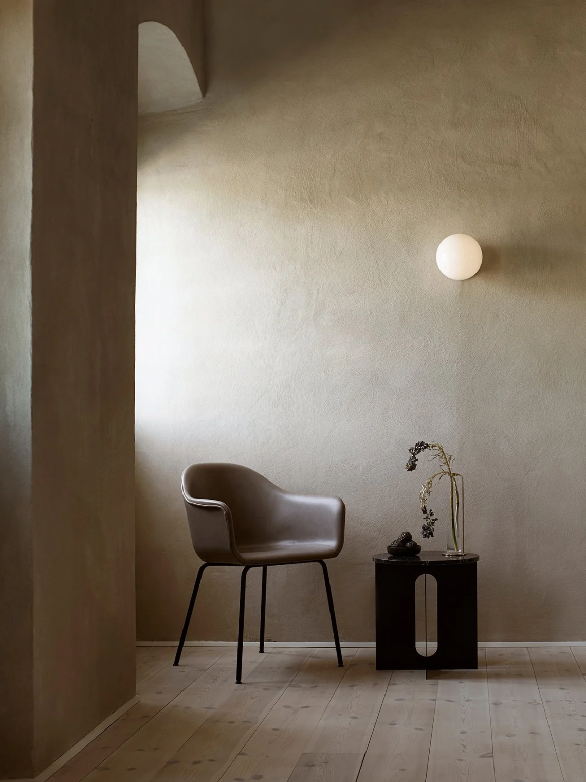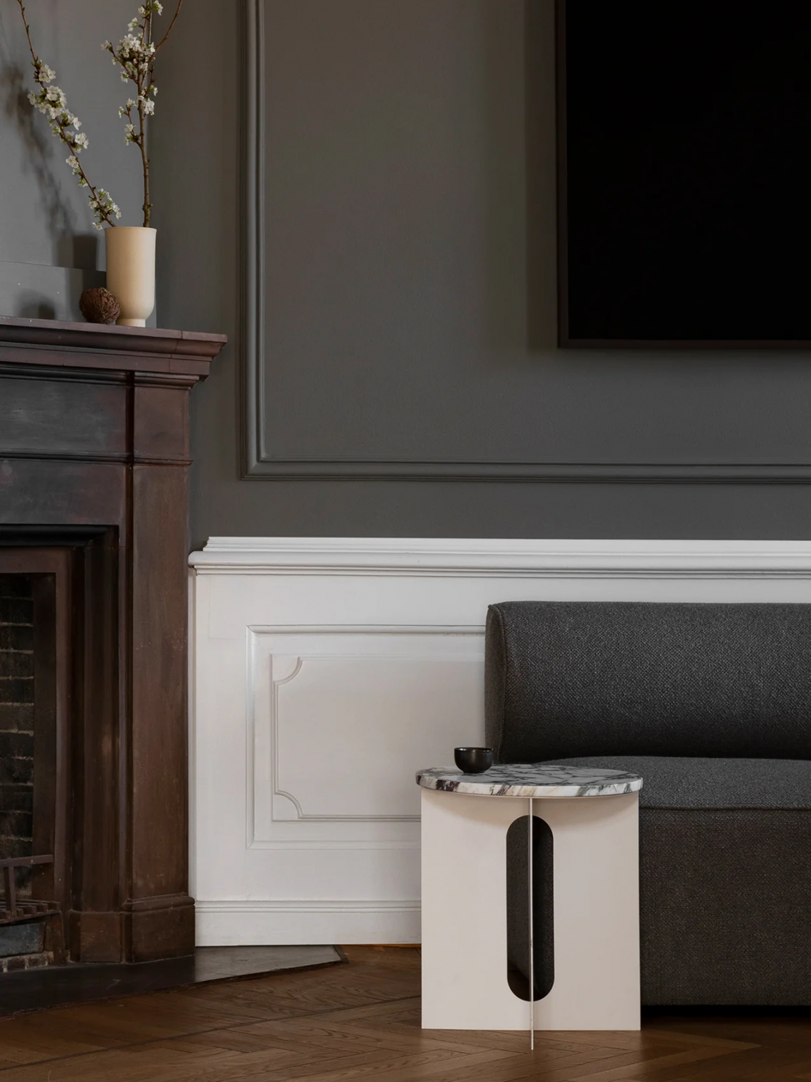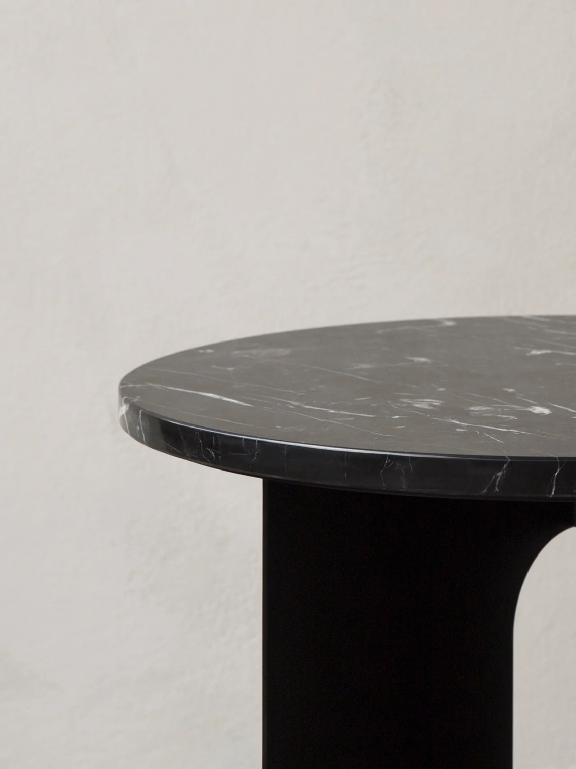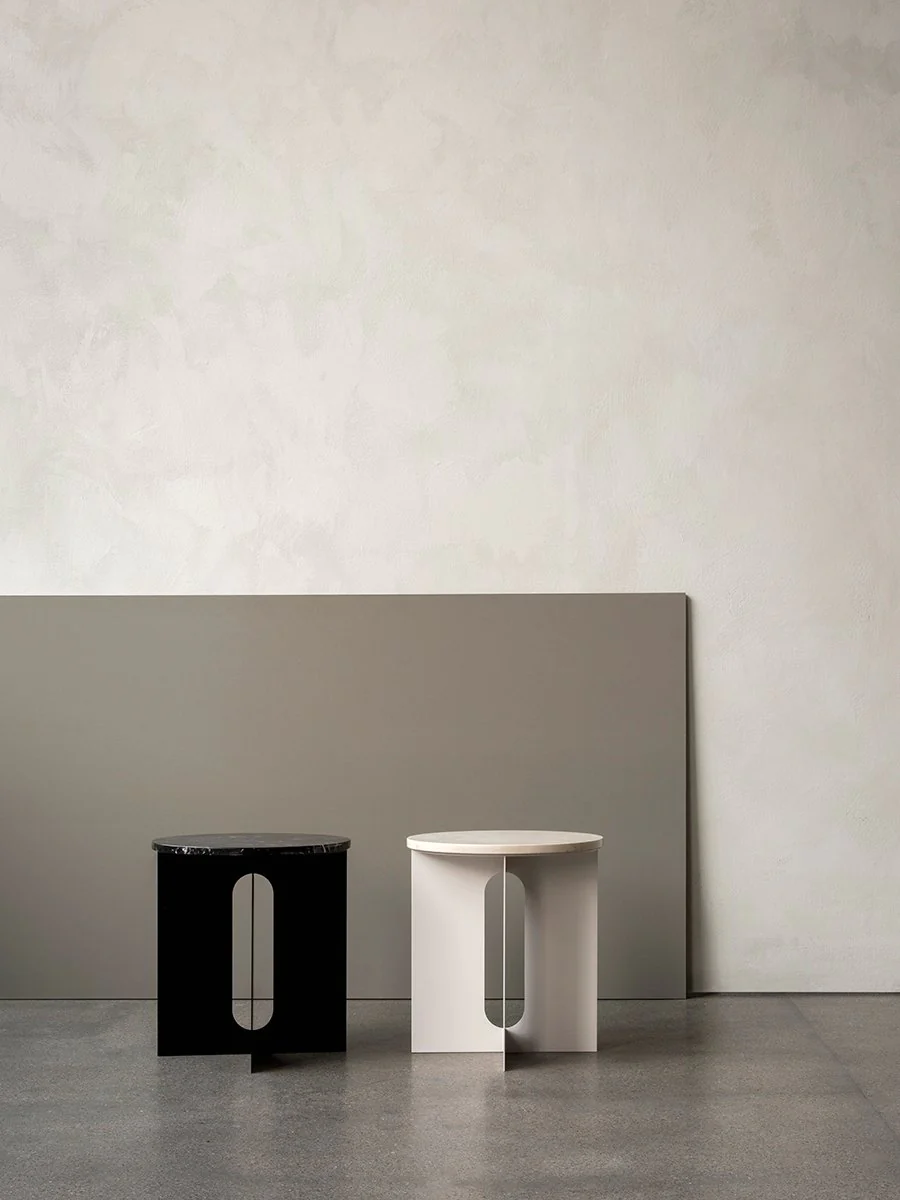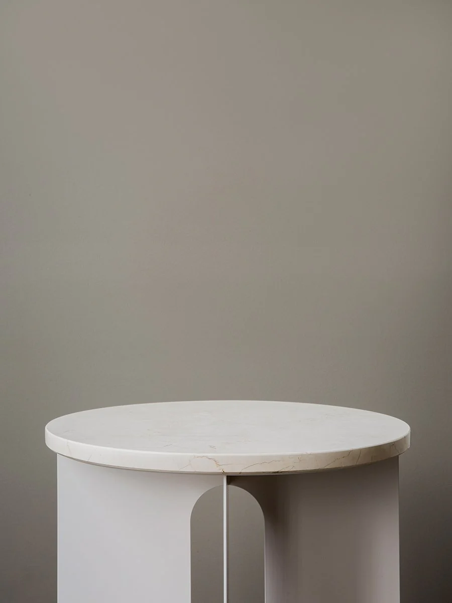 The perfectly proportioned table comprises a sturdy powder coated steel base on which a rounded marble tabletop is balanced. The table’s refined marble top, which barely hangs over the legs to create an overall sense of balance, and contrasting wide, flat legs – laser-cut for precision – make it an easy fit for a range of de?cor styles. Both base and top are available separately and in ivory or black powder coated steel and white or black marble respectively for total customization.