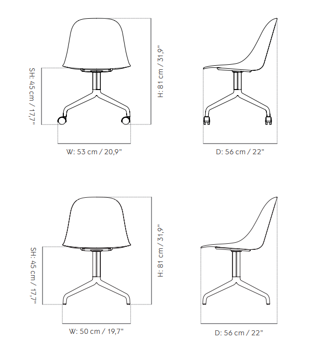 Once you’ve chosen the Harbour Chair shell style that will be cradling and supporting your body, you can now also choose a clover-shaped swivel base so you can spin around as needed – and roll around as wanted, should you opt for caster wheels. The base is available with either swivel or swivel with return options in three finishes – polished aluminum or powder-coated aluminum in black or light grey.