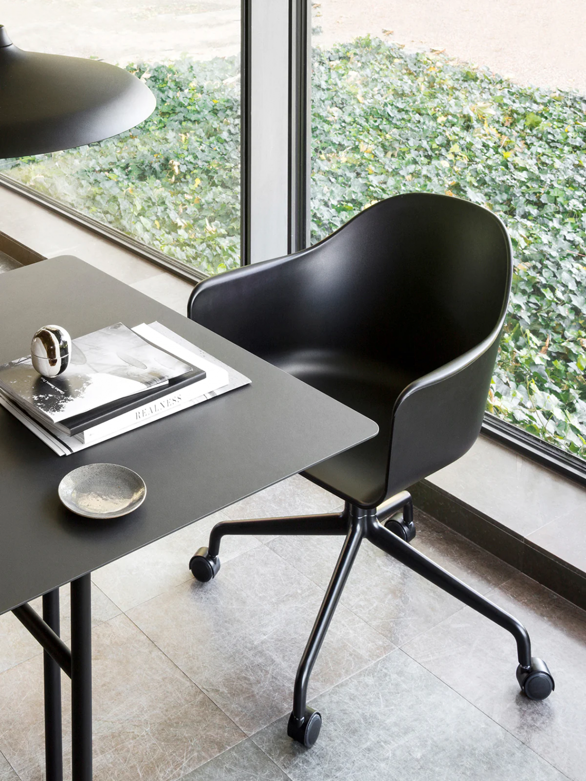 Once you’ve chosen the Harbour Chair shell style that will be cradling and supporting your body, you can now also choose a clover-shaped swivel base so you can spin around as needed – and roll around as wanted, should you opt for caster wheels. The base is available with either swivel or swivel with return options in two finishes – polished aluminum or powder-coated aluminum in black.