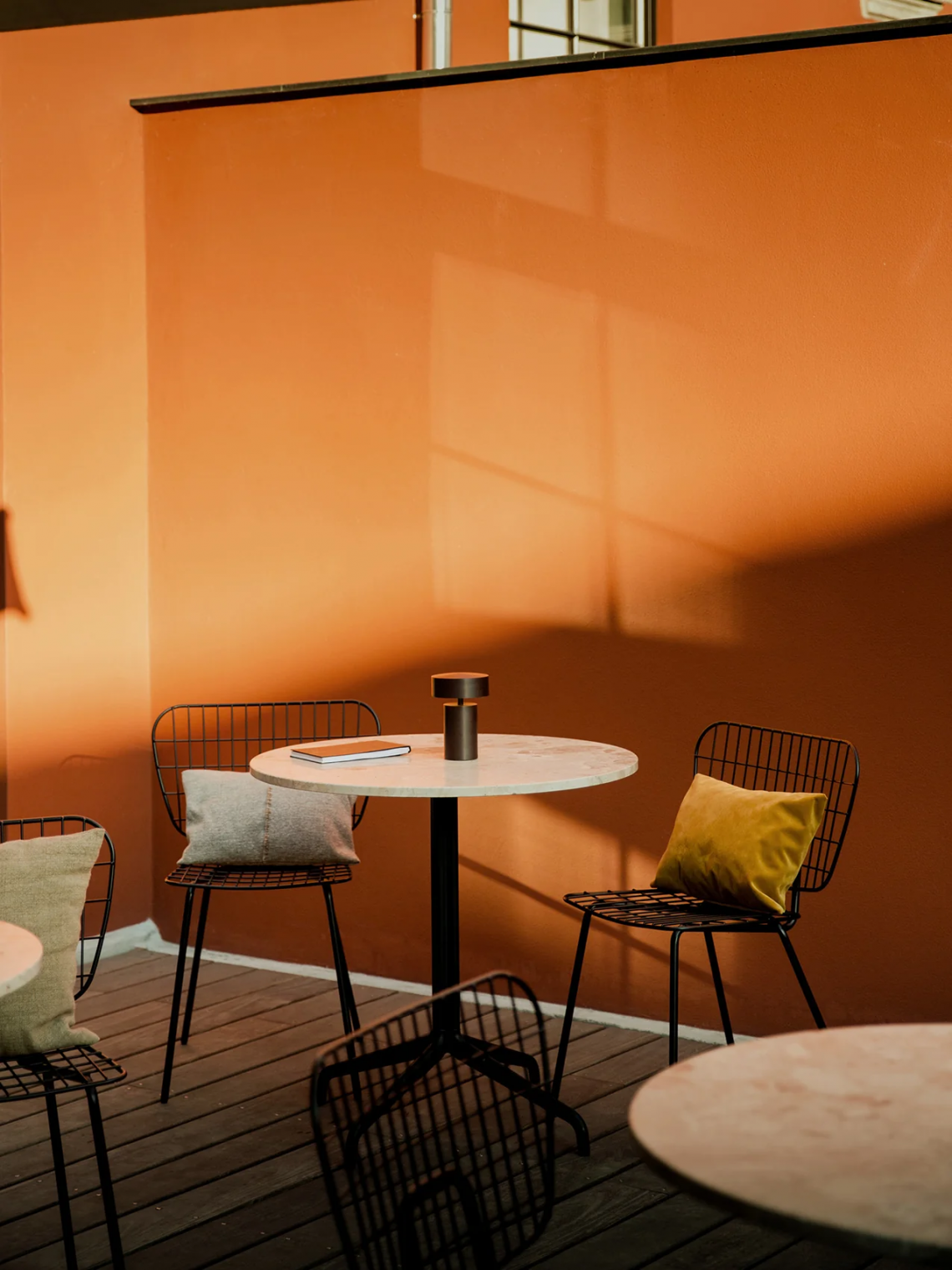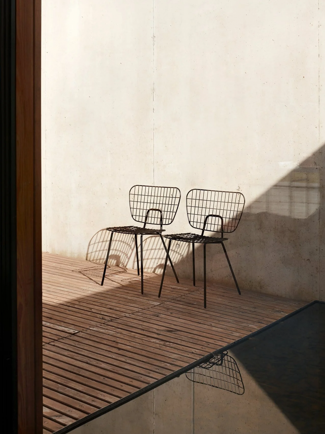 Studio WM explains, "The strength of metal gave us the freedom to push the boundaries and seek for the thinnest, most light construction to bring light into the design in a literal and figurative sense. The contrast between the thin metal wire and soft pillow evokes the urge to touch and use the product." The WM Chairs are very durable and suitable for both indoor and outdoor use.