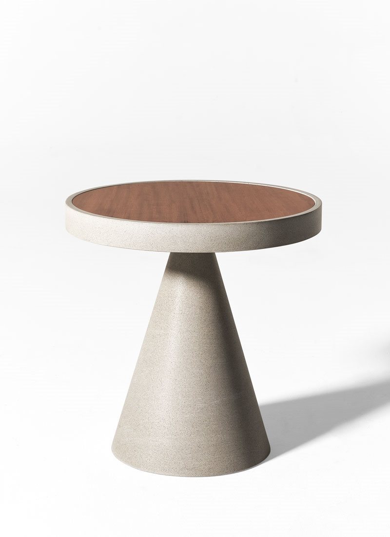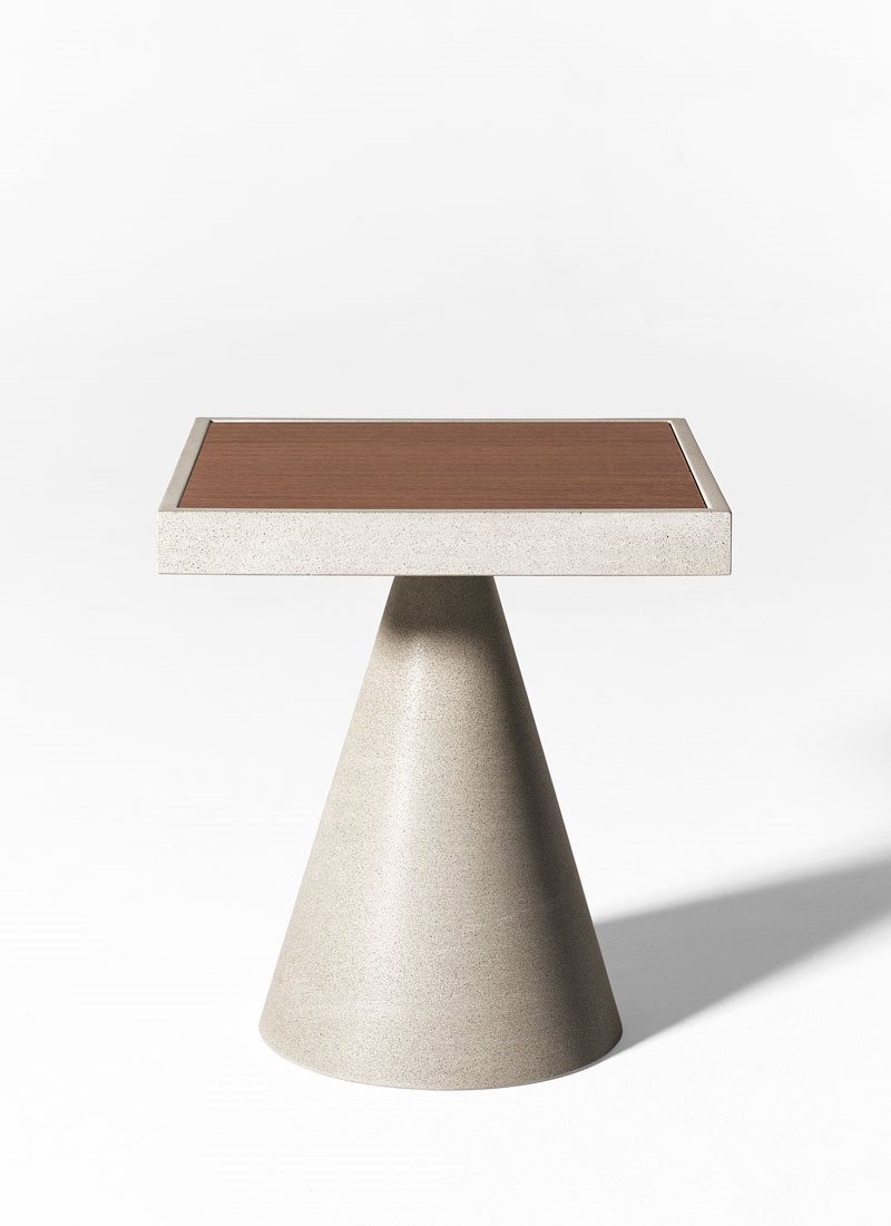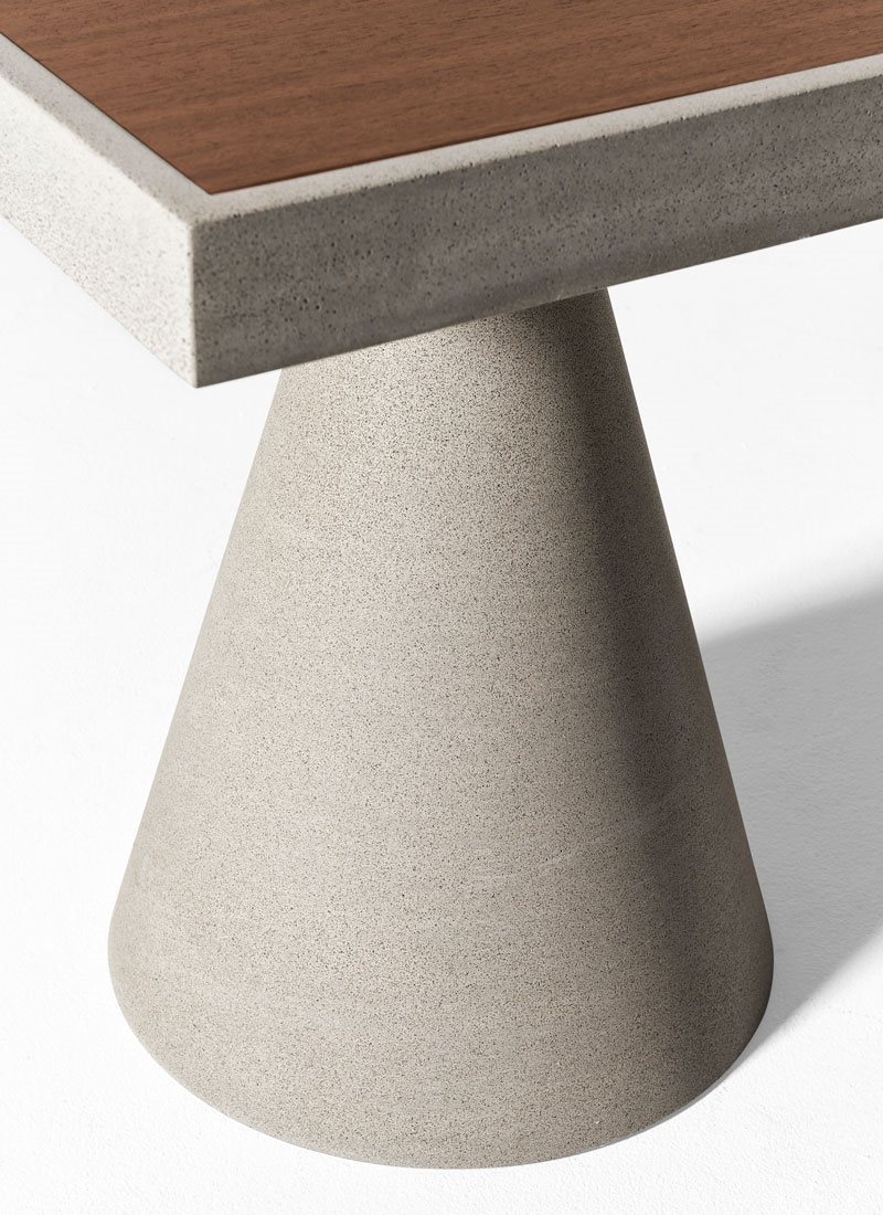 Cone Open Air是茶幾系列。它圓錐形的底座和淺灰色的飾面是由Ductal混凝土制成,精細的天然礦物成分和有機纖維組成,使其具有很好的柔韌性,這種高品質材料,也可用于室外。 桌面由伊羅科木材制成,有正方形或圓形兩種可供選擇。