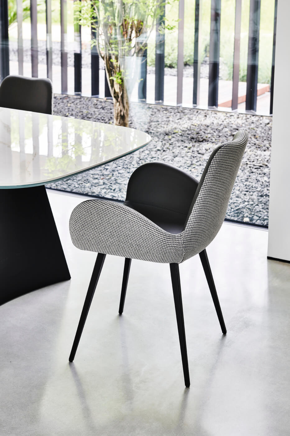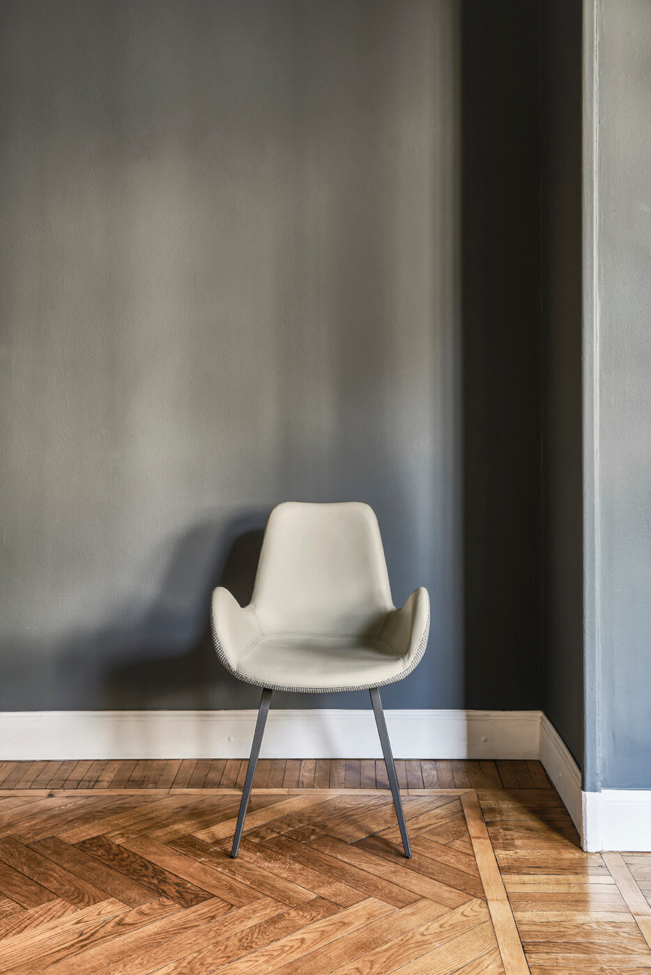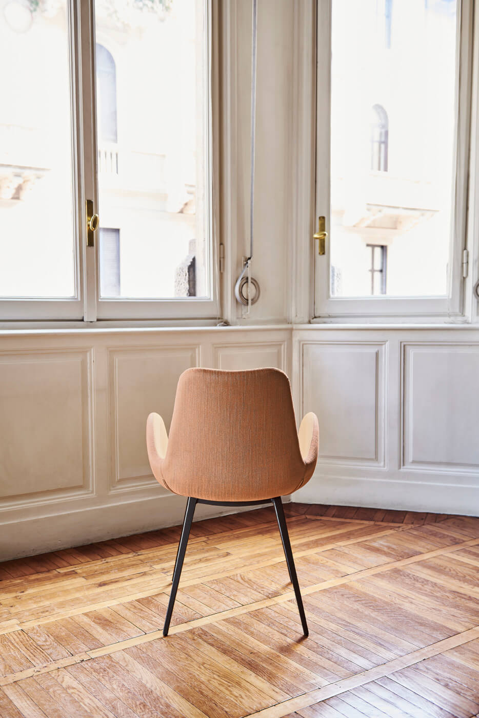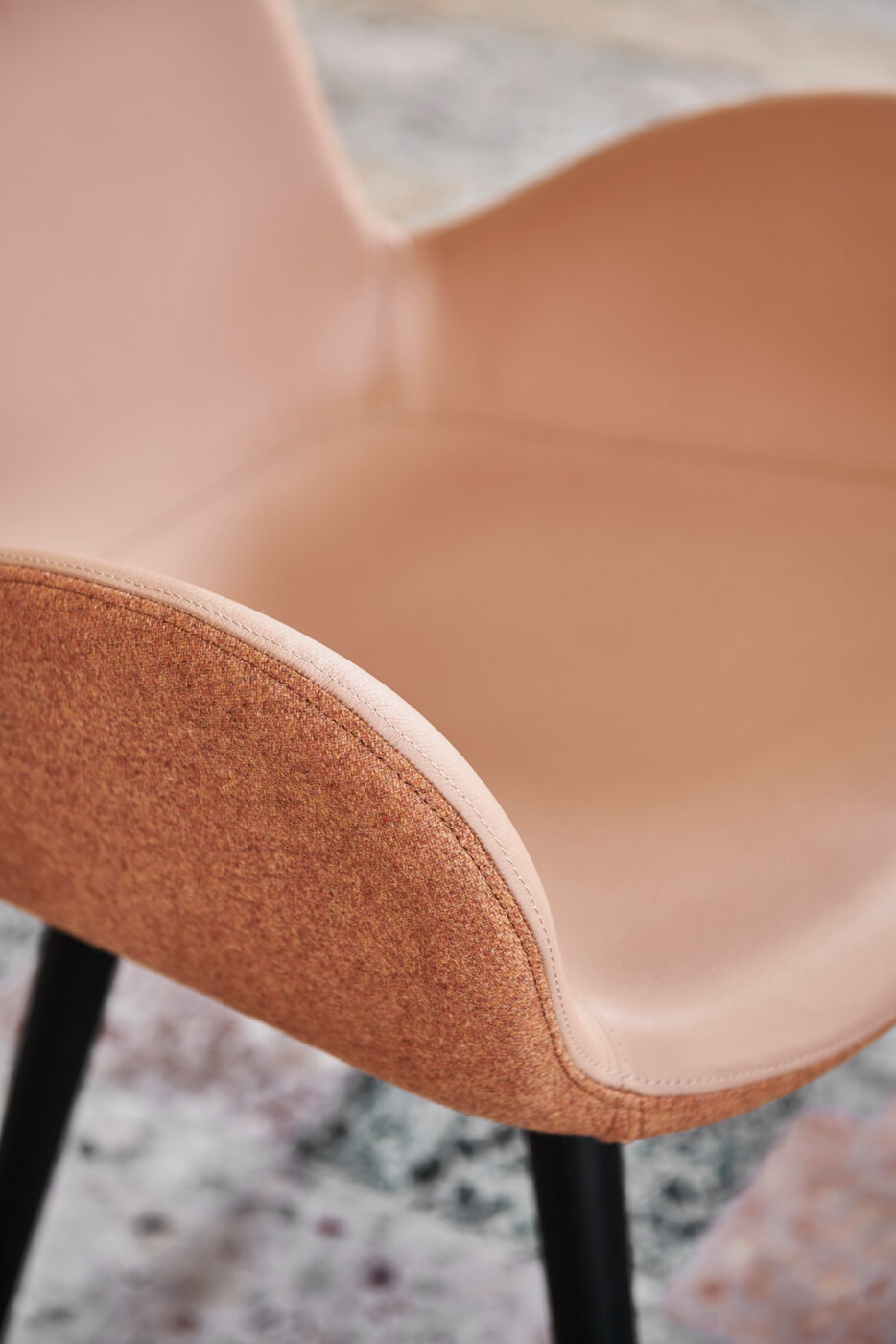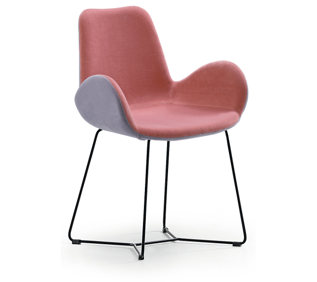 Dalia armchair with low backrest and wooden base. Seat upholstered in fabric, leather or faux leather.