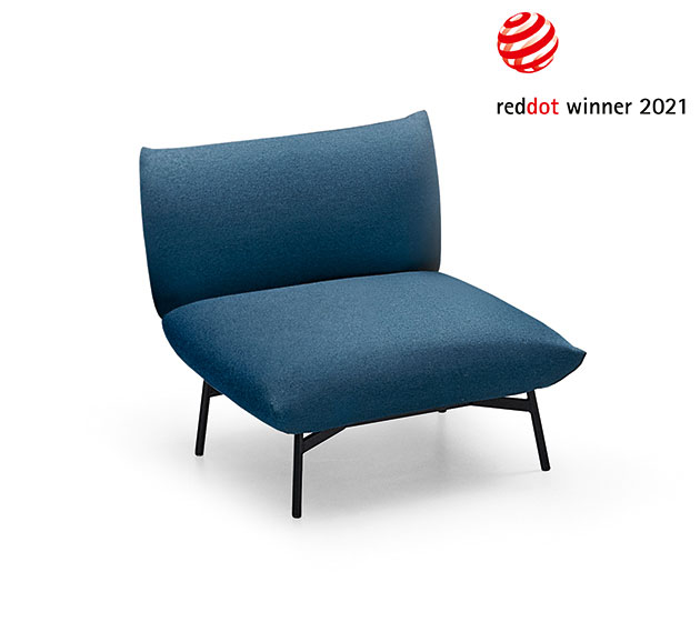 Armchair with four-legs base in painted metal. Seat and backrest upholstered in fabric. The Area armchair is also available with armrests.