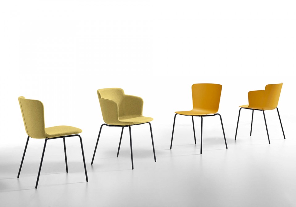 Calla armchair with four-legs base in lacquered steel. Polypropylene seat suitable for outdoor use. Optional: cushion in fabric, leather or faux leather.