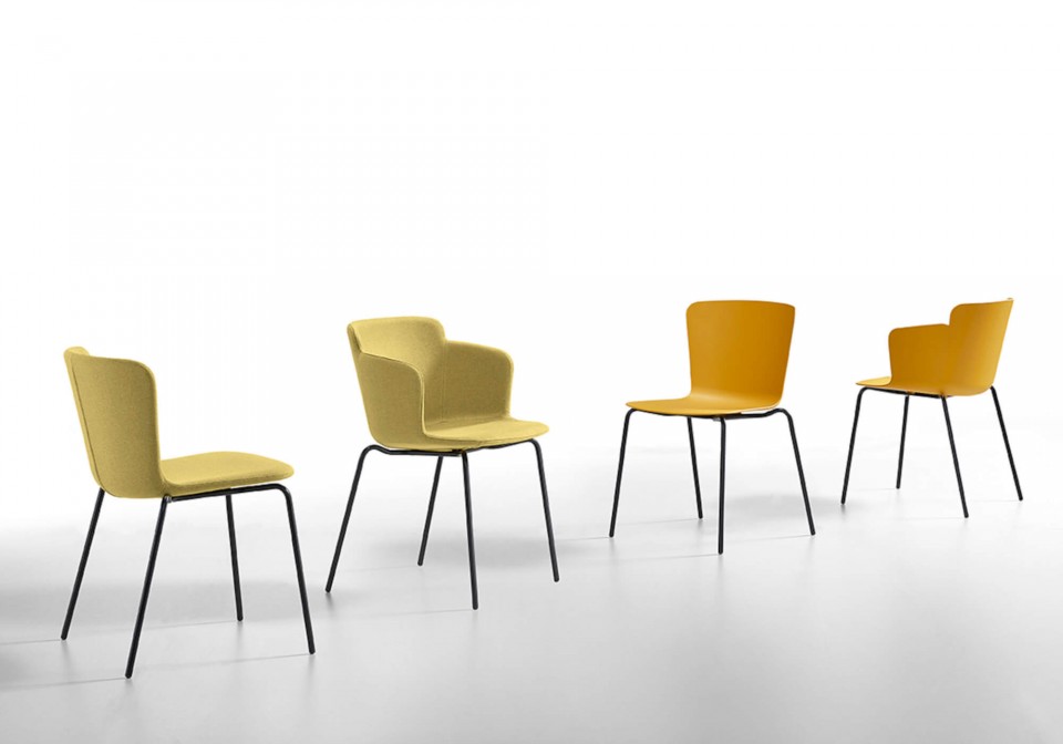 Calla armchair with four-legs base in lacquered steel. Polypropylene seat suitable for outdoor use. Optional: cushion in fabric, leather or faux leather.
