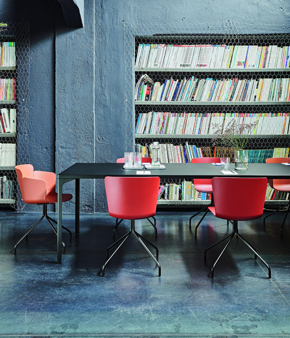Calla armchair with four-legs base in lacquered steel. Polypropylene seat suitable for outdoor use. Optional: cushion in fabric, leather or faux leather.