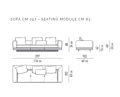 With its geometric rigour, the base creates an original contrast with the softness of the seat, conceived as a single cushion punctuated by light stitching defining the width of the seat - 83 or 68 cm - and with the structure of the backrest and armrest, covered in channelled goose down padding. The backrest and armrest form a single volume, with a 45° split in the corner.