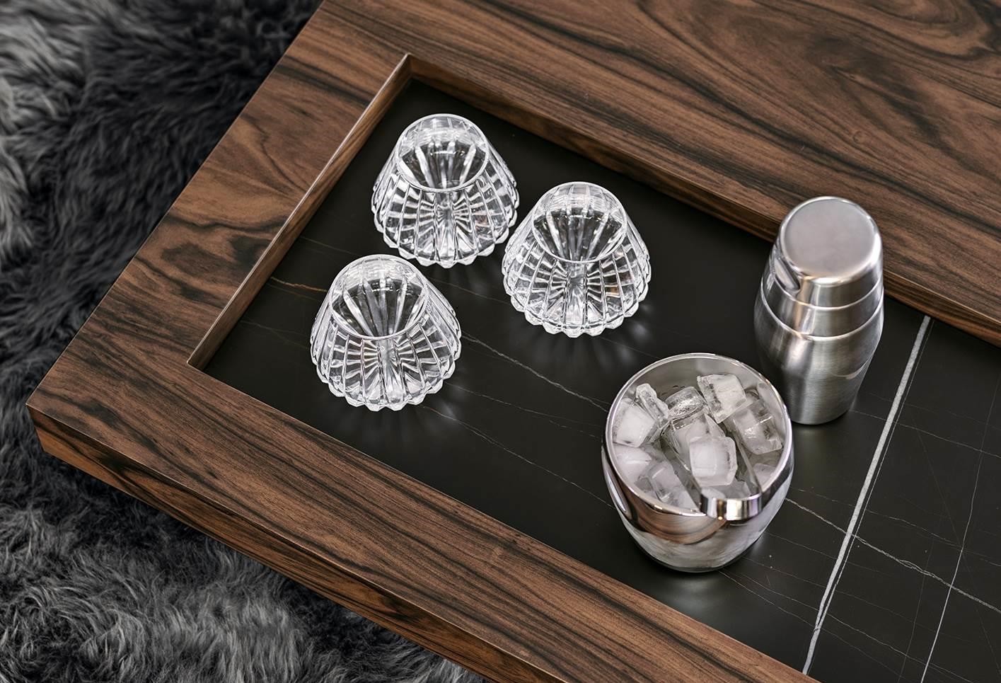 They come both in Eucalyptus wood in matt lacquer finish and palisander Santos in matt polyester lacquer finish, both combined with the Sahara Noir marble, matt polyester finish, covering the built-in tray.