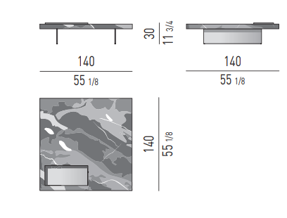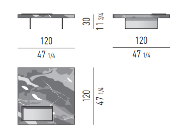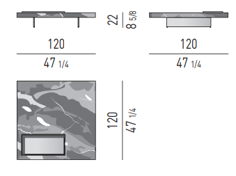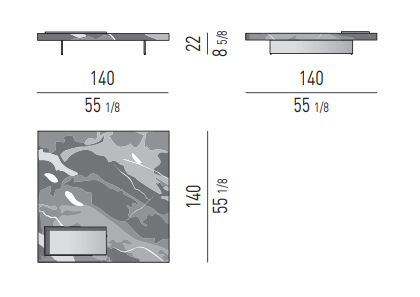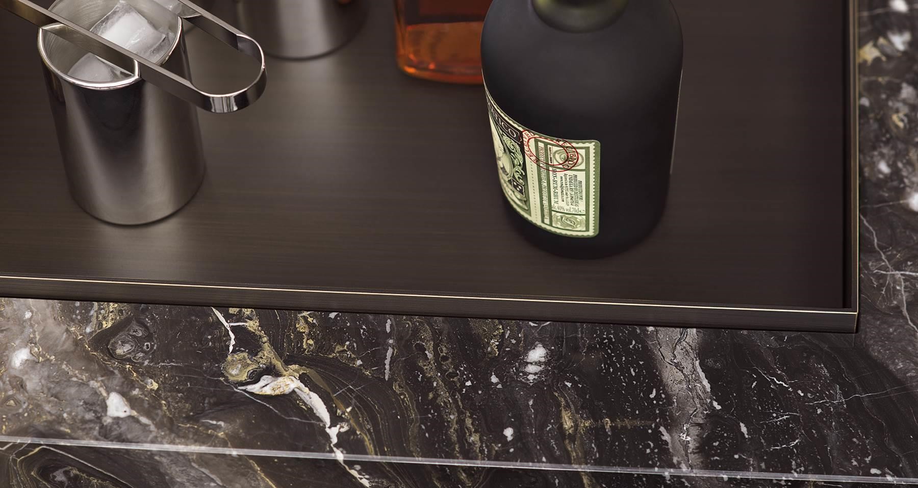 Alternatively, a top in Grigio Orobico marble features a lowered metal tray with a Golden Brown finish, like the legs. The edge of the tray protrudes from the top by 15 mm.