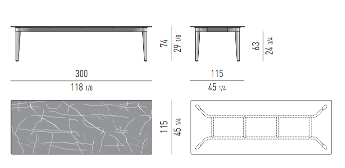 Tapered legs, with a soft, retro-inspired aesthetic and a stone-effect ceramic top, are the distinguishing features of the Terrace table, designed for use in open-air living spaces.