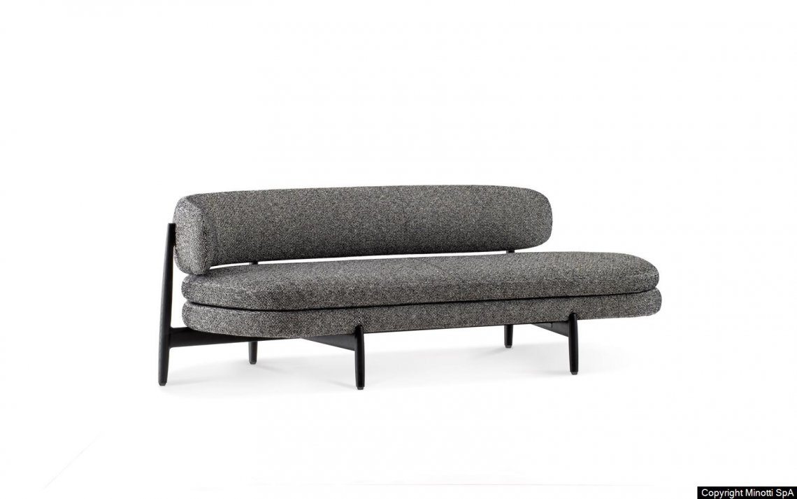 The architecture of this object, raised off the ground, rises above the seat to support and frame the backrest, lending an aerial elegance to this sofa proposed by Minotti for both residential and hospitality projects.