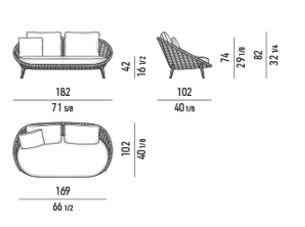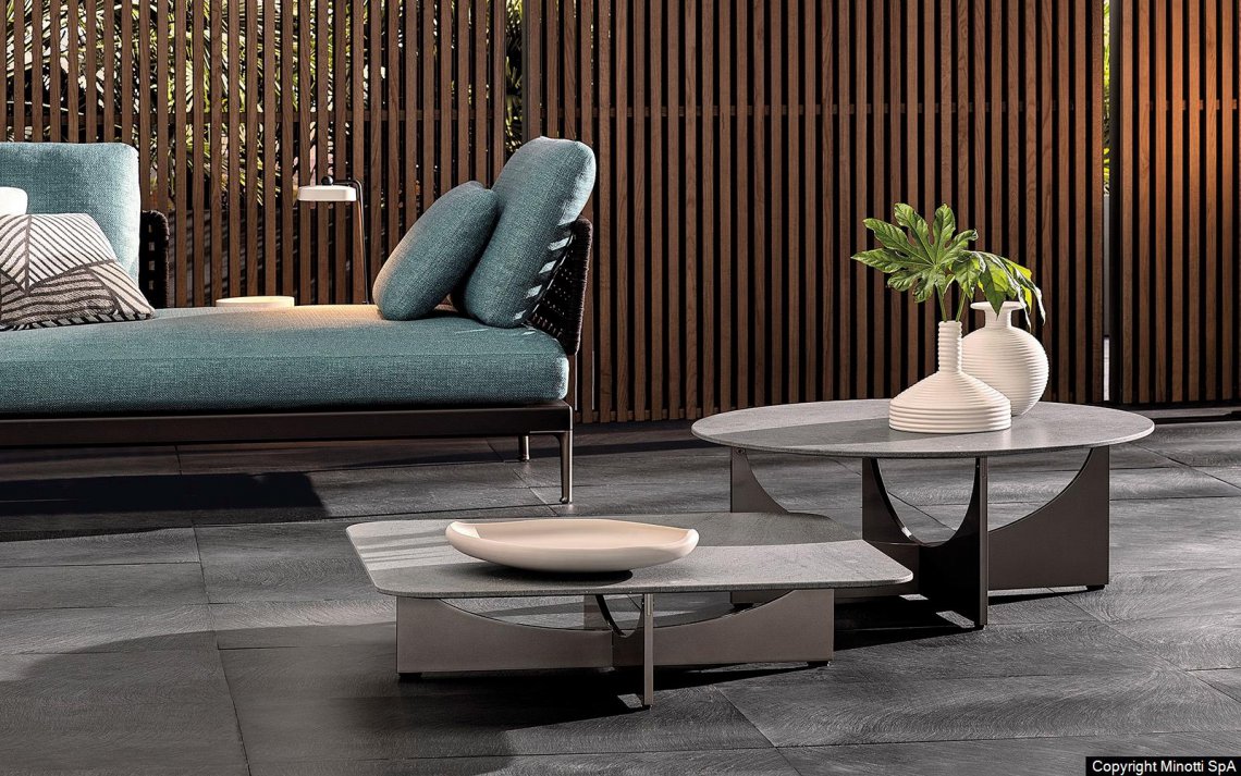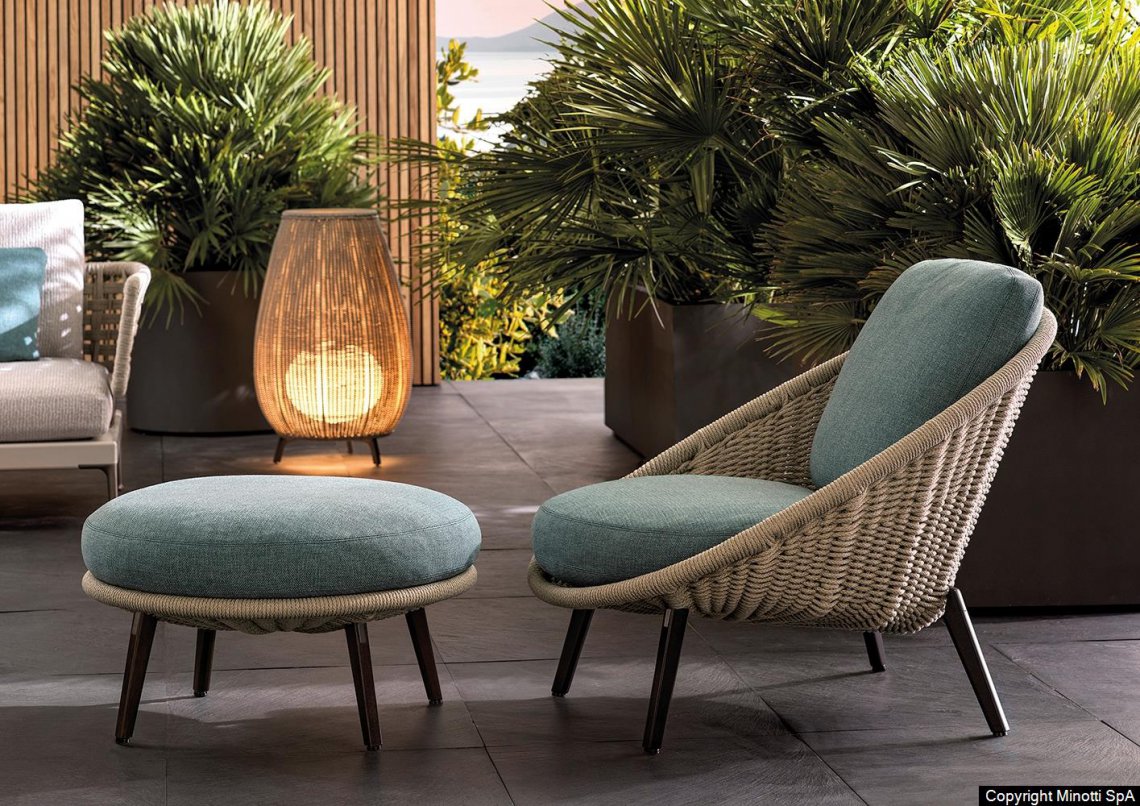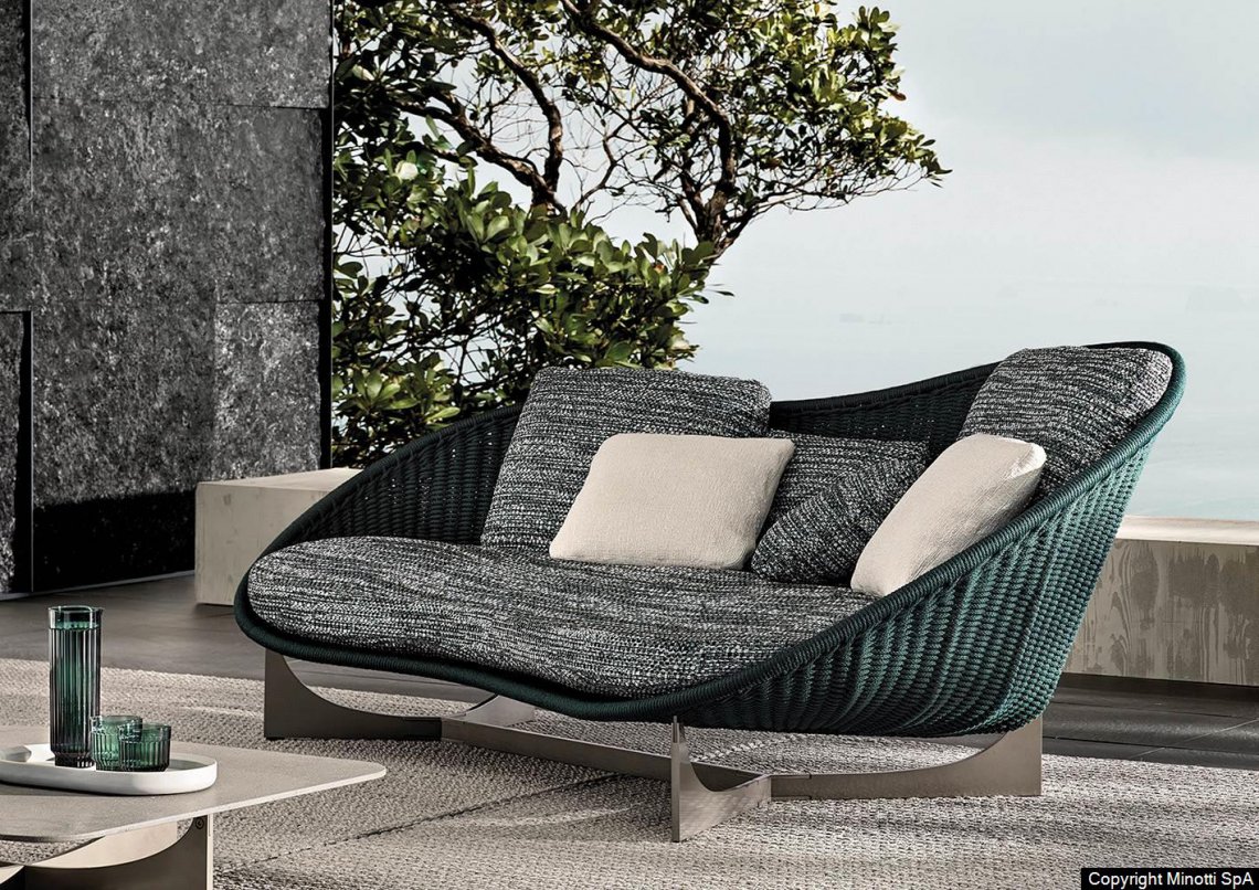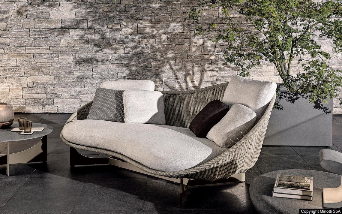 The design, which perfectly expresses the vision of Minotti, capable of interpreting indoor and outdoor spaces with the same strong coherence, is produced using clever, advanced technology and materials conceived specifically for open air environments. The frame of the backrest is in stainless steel with a Bronze-coloured varnish and covered in polypropylene cords in shades that can vary from the more neutral and traditional tones of Dark Brown and Sand to brighter ones also inspired by nature and the chromatic development of the entire collection, Citron, Blue and Petroleum. Colours related to images of faraway landscapes that bring freshness and character to this family of outdoor furnishing pieces with an enveloping look inspired by the 1950s.