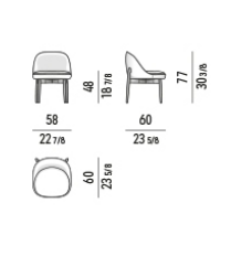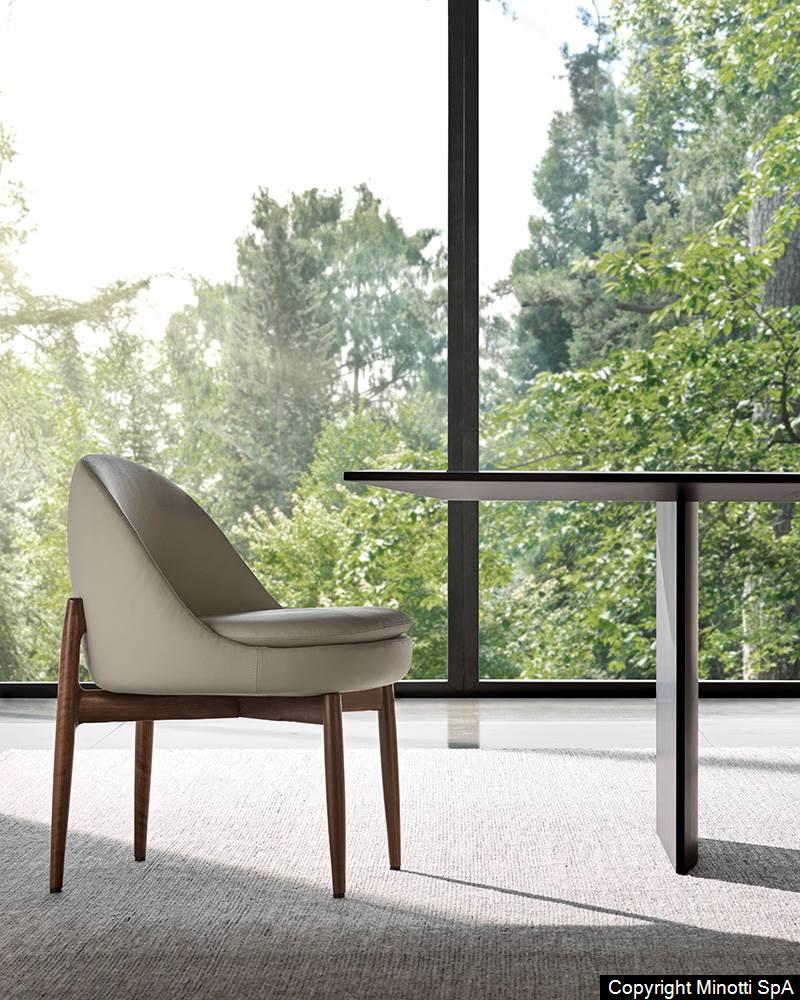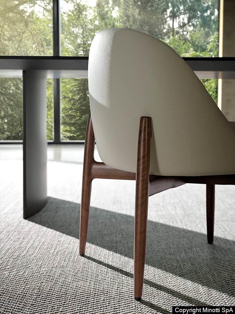 Like slender trunks, the elegant, polished legs, in Canaletto walnut solid wood stained Light Brown, or Liquorice lacquered ash, rest on the ground, lifting the enveloping upholstered body and creating a soft rhythm of vertical lines.