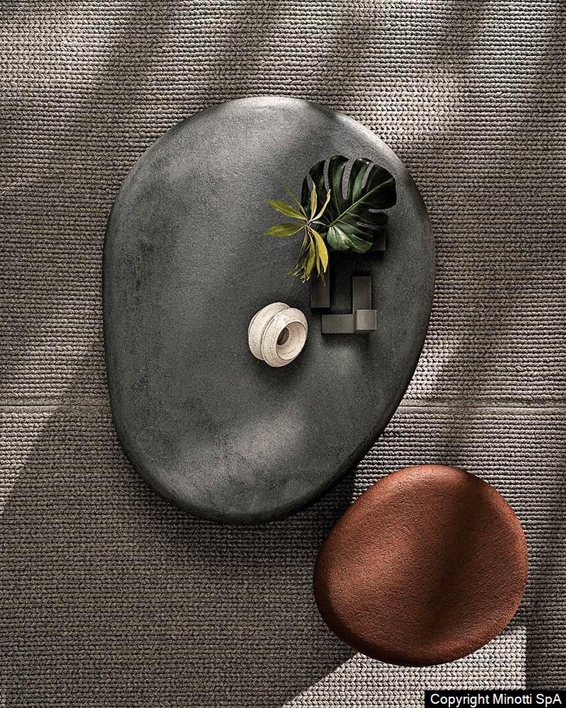 With its irregular shape and rounded corners, the Stony coffee table is inspired by pebbles, smoothed by the water of rivers, and it figures as a natural element in the landscape designed by the Outdoor Collection.