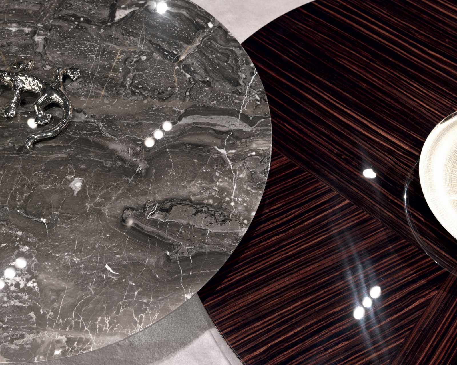 木紋的自然氣息和潤澤的Macassar高光飾面將圓形或方形不同形狀的茶幾呈現出雕塑質感,散發著吸引力,