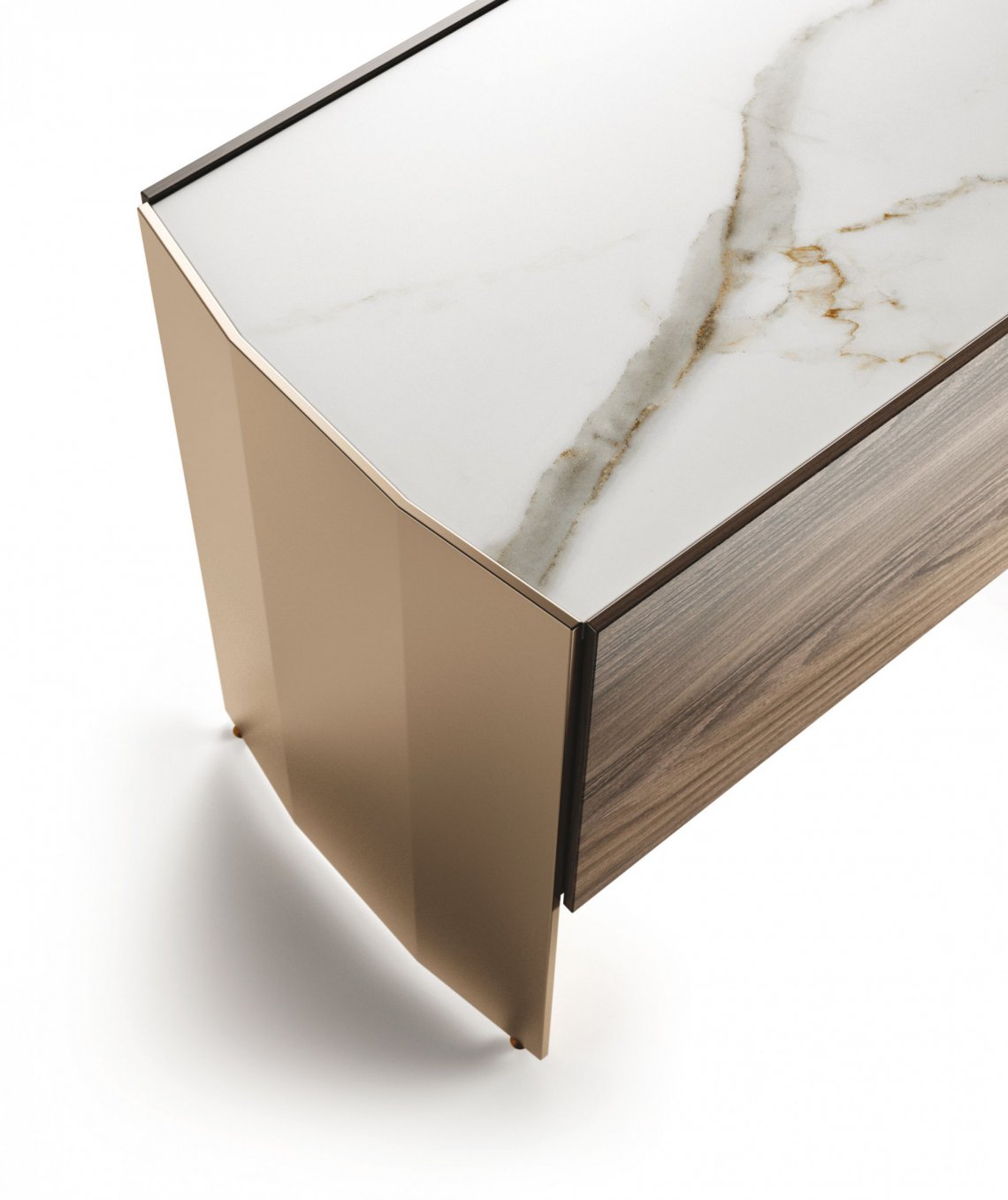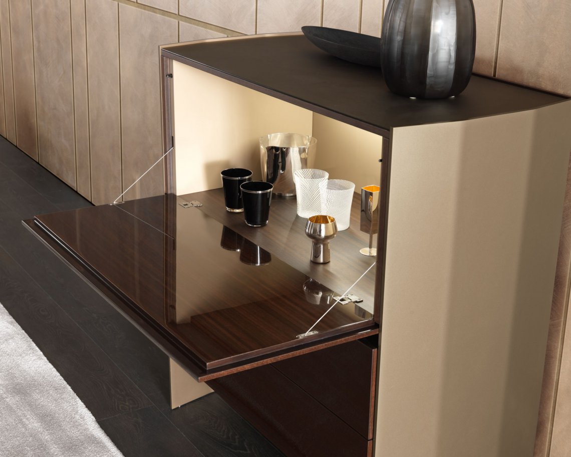 槍灰色或者青銅色的鋁合金框架側板,與胡桃木,灰榆木,白蠟木,煙熏橡木或黑橡木,加上珍貴的實木,漆面或大理石等材質構成多種抽屜選擇。再配有原色或者煙熏色玻璃層架,和通常以實木或理石臺面材質的抽屜柜完美匹配,賦予一種本真的意味。