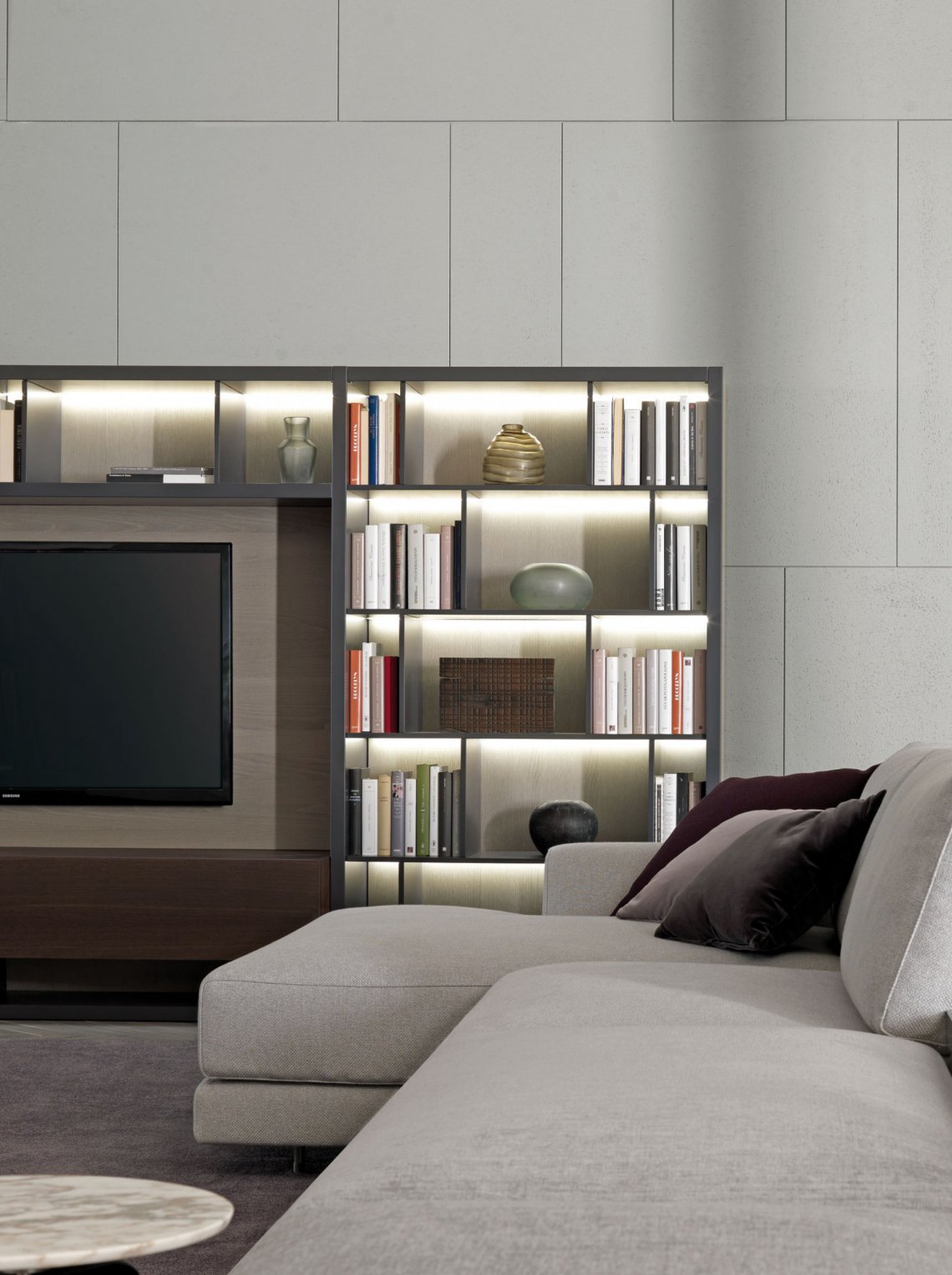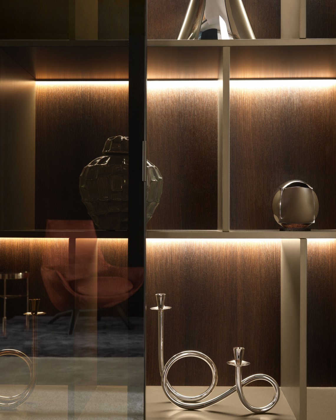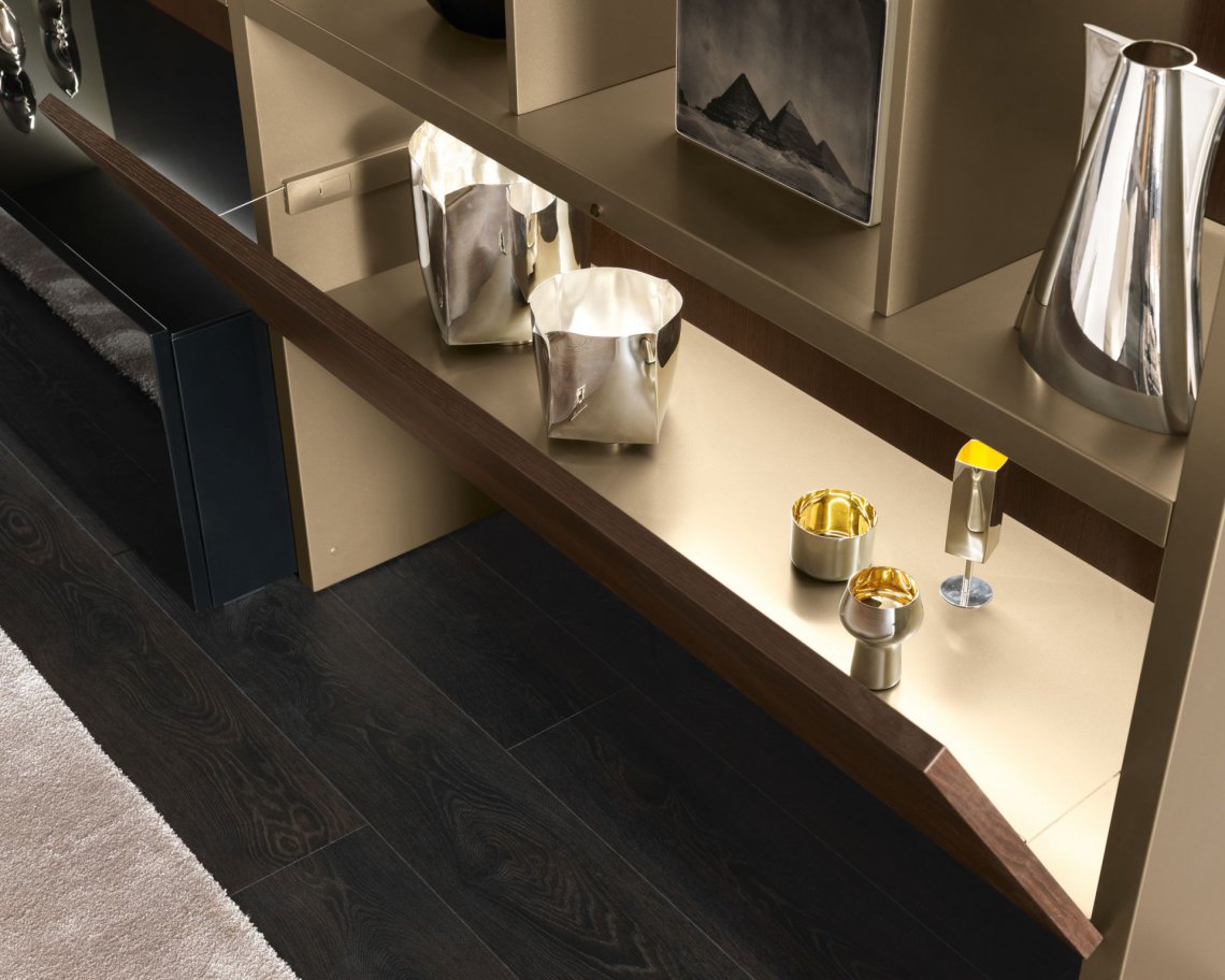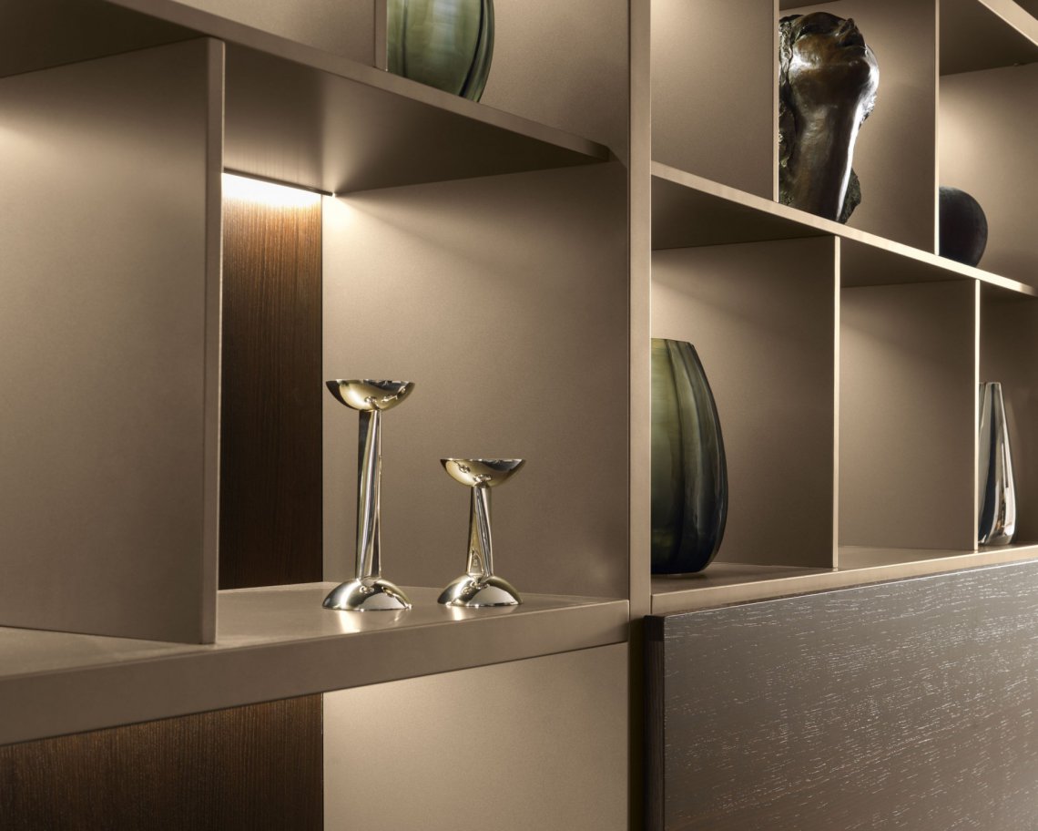 Crossing墻體系列巧妙融合多種不同的潮流元素,包含交替的層架,帶上、下翻門及三維立體玻璃門的吊柜,呈現(xiàn)通透明亮的視覺效果。柜體內(nèi)部配置定制LED照明系統(tǒng);鉸鏈門配置阻尼開關(guān)系統(tǒng)。集美感與功能設(shè)計(jì)于一體。真正的創(chuàng)新刷新了書箱的概念。它所組成的嵌板,重量輕,使書柜懸掛起來,賦予了一種全新的“可見明度”的感覺。