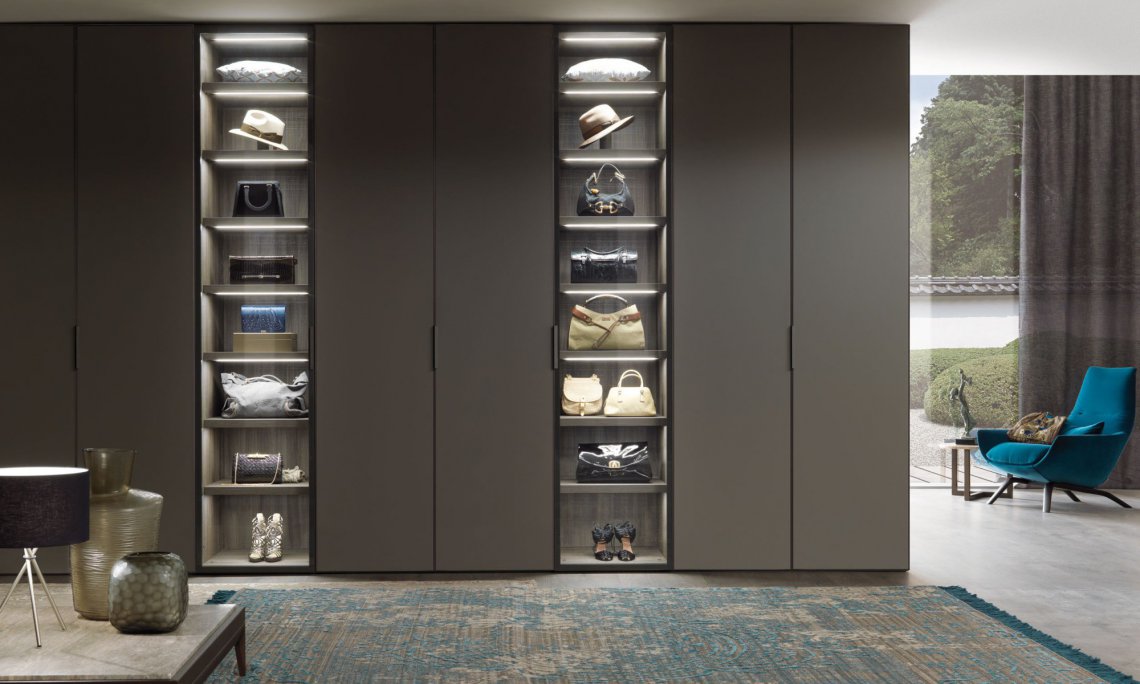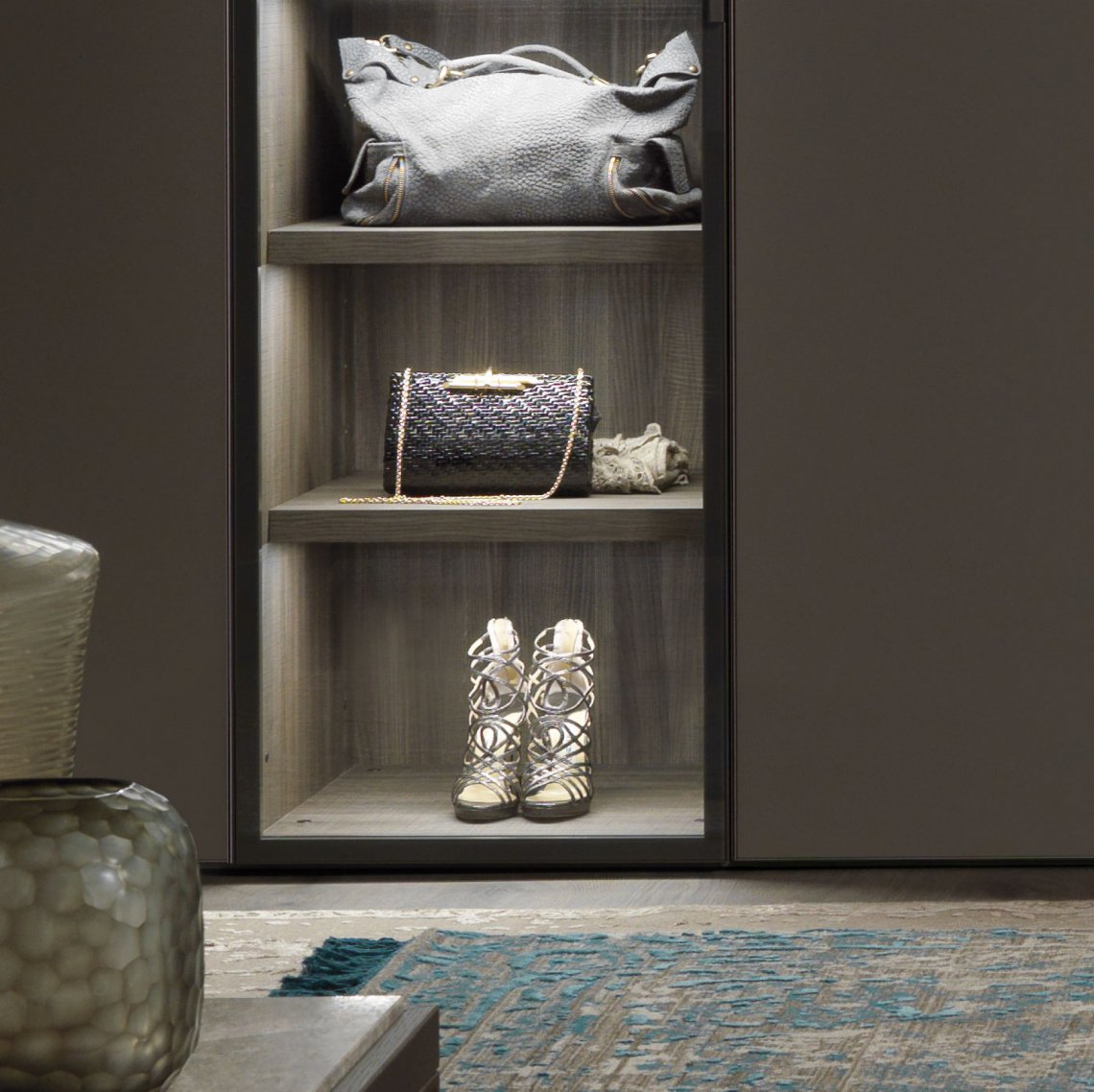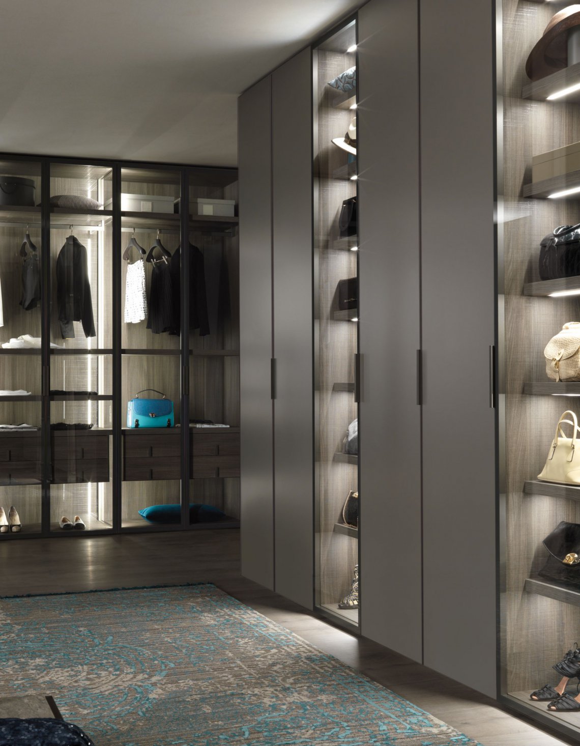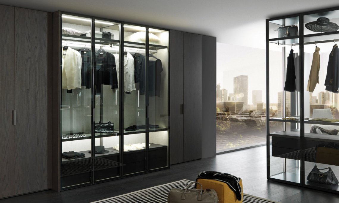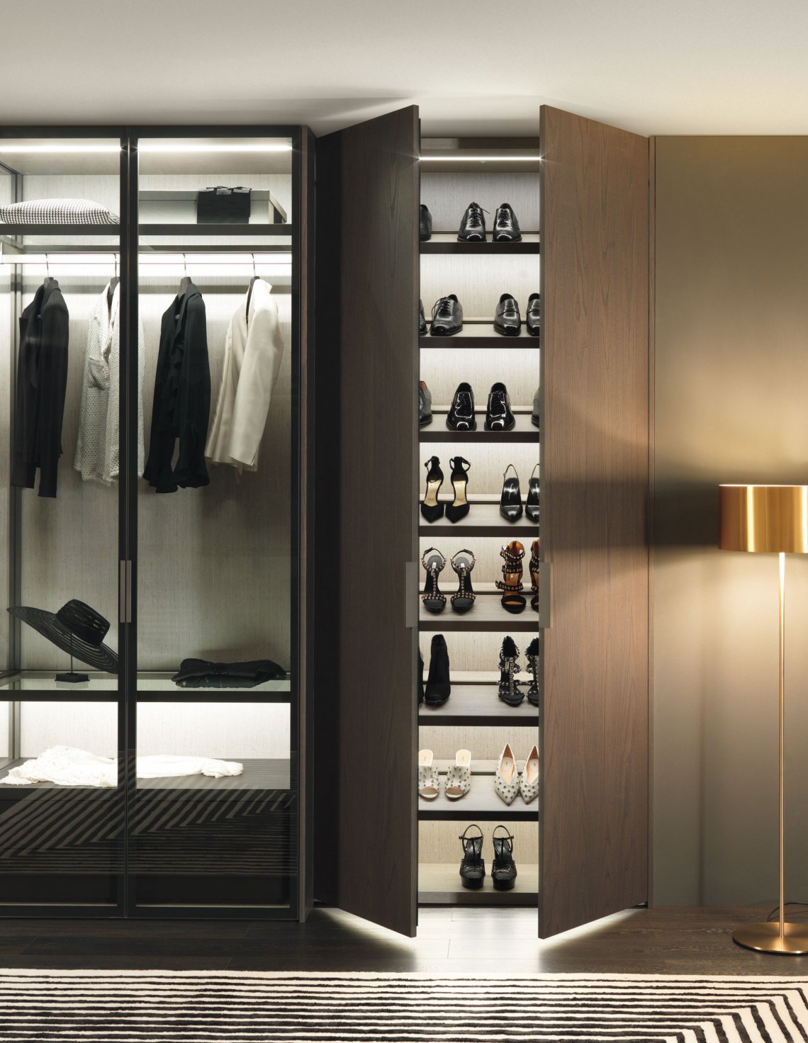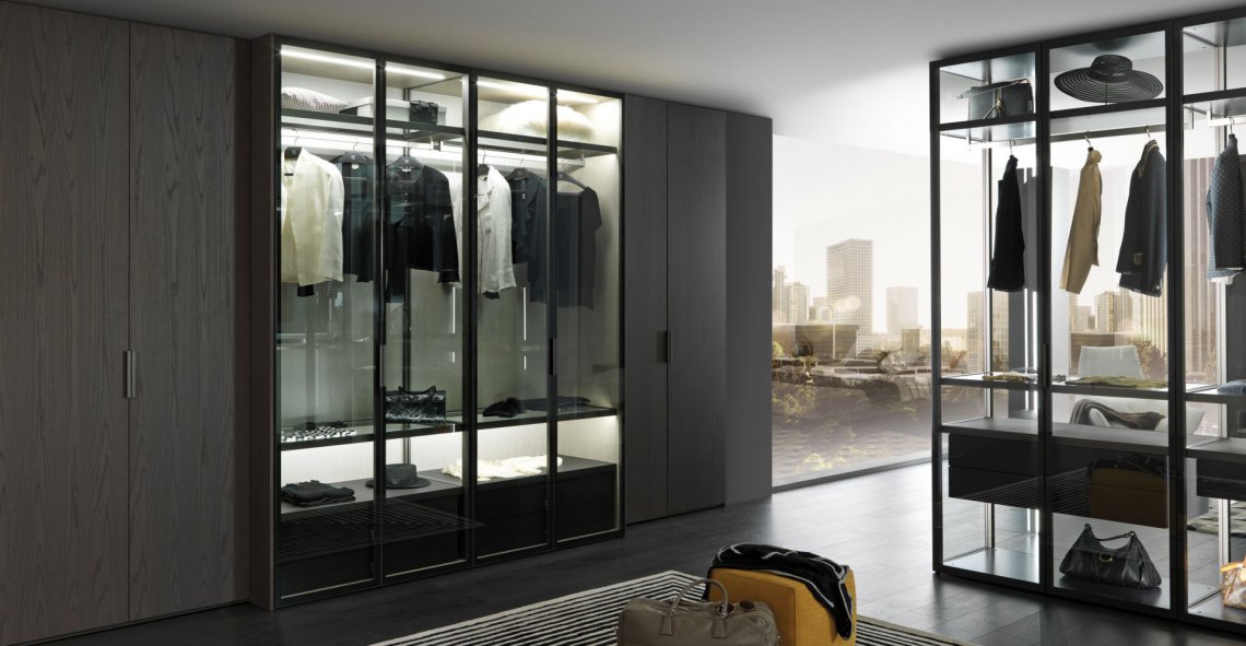 I-Box衣柜系統:Narcisse門產品系列由透明玻璃和鍛光鋁合金框架打造,內部結構和抽屜柜則是熏橡木美耐板材構成,簡約優雅的線性設計反映傳統價值和當代需求。