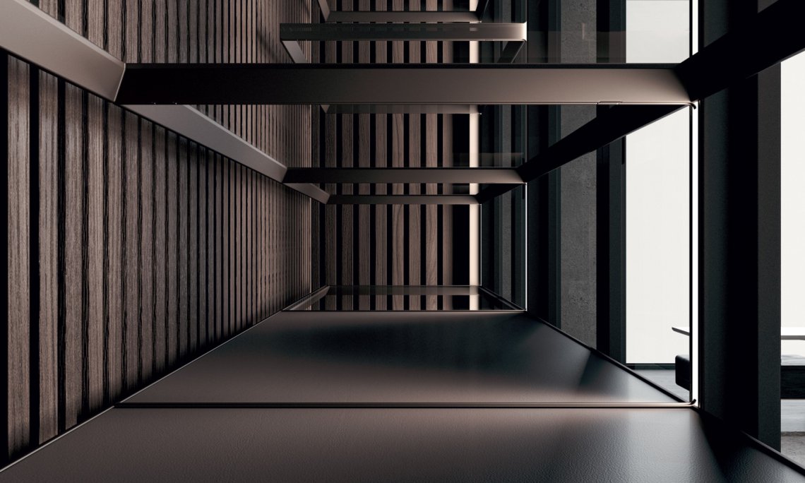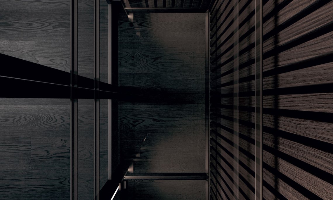 The product is compatible with all the doors already contained in the Palo Alto I-box system, and with the evolution of the Rex door, featuring an innovative opening mechanism, similar to a pantograph, that permits the movement of one or more pairs of doors from their closed position to total 180° opening, placed over the doors of the adjacent compartment. The result is the total opening of spaces of about two meters.